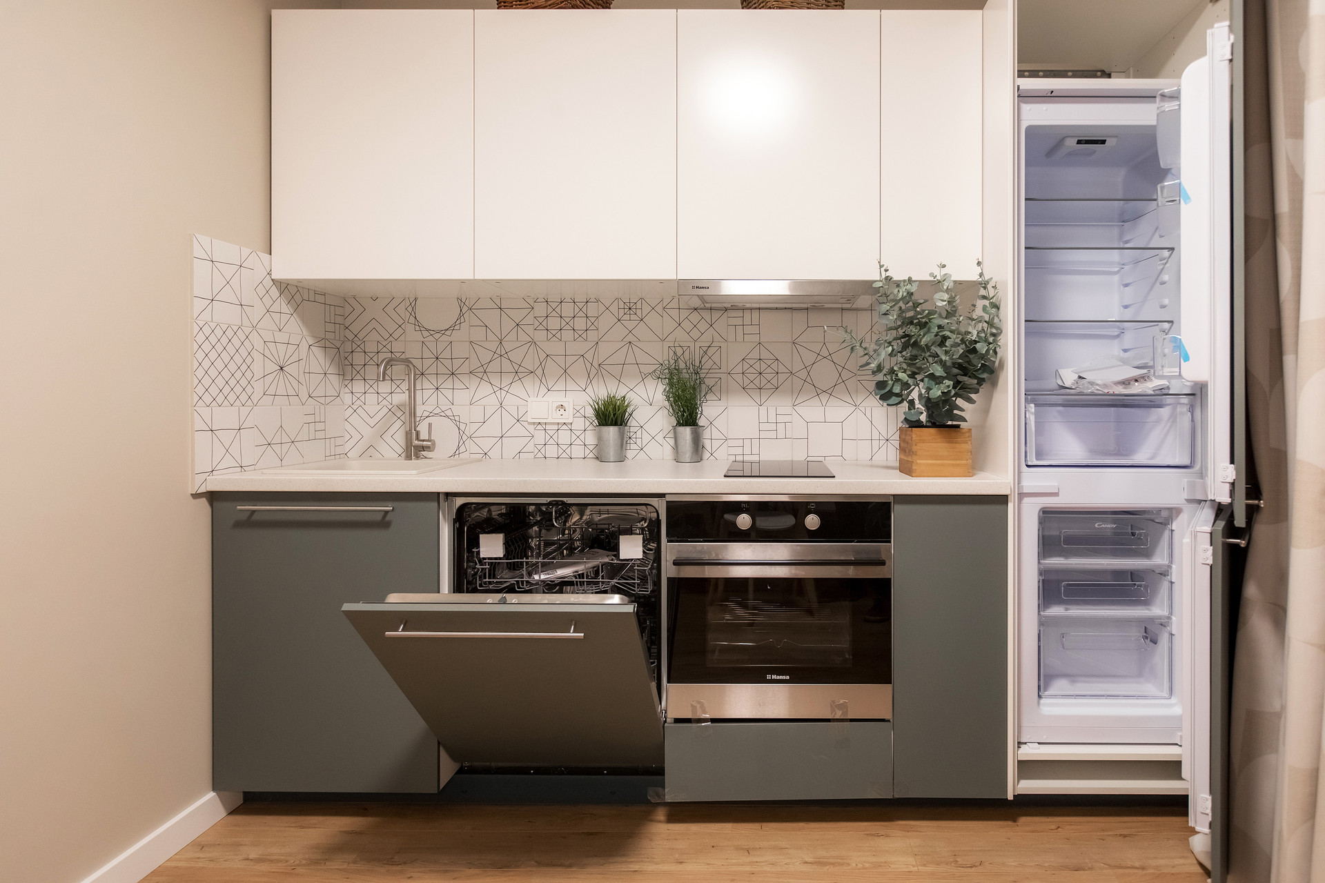 Квартира продается со всей техникой, изображенной на фотографиях в объявлении: встраиваемый холодильник, индукционная варочная панель, встраиваемая духовка, вытяжка, посудомоечная машина.