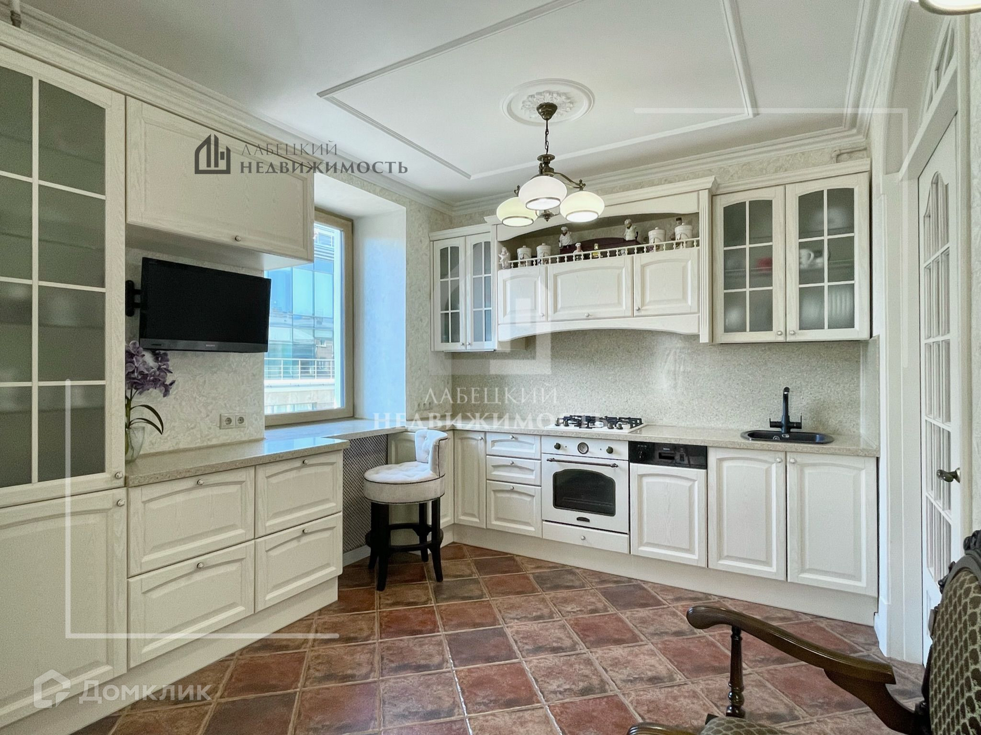 - КУХНЯ (12.5 м²), где остаётся кухонный гарнитур ИЗ МАССИВА, столешница и фартук из искусственного камня, ВСТРОЕННАЯ ТЕХНИКА,