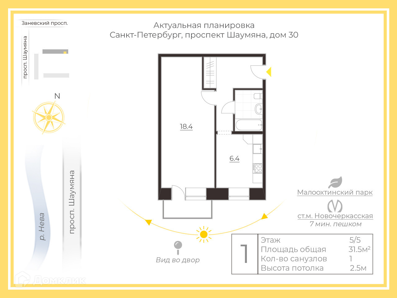 1-комнатная квартира, 31.5 м2, этаж 5 / 5, на продажу в Санкт-Петербурге, проспект Шаумяна, 30