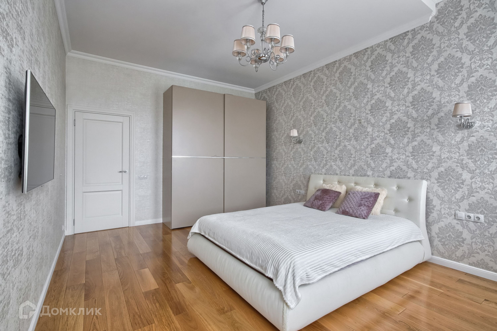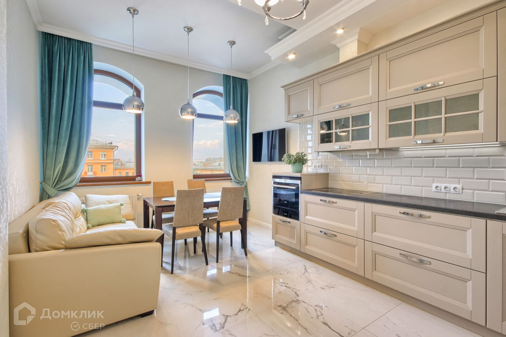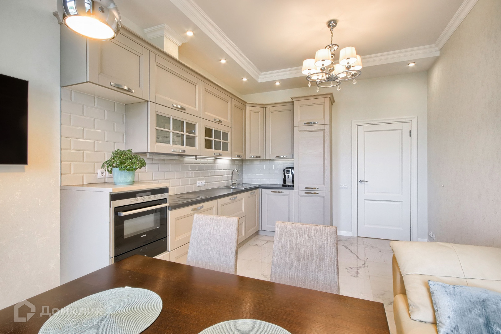 В квартире проведён дизайнерский ремонт: уложен паркет, на стенах европейские обои, хрустальные светильники. Жилая площадь используется с умом: уютная кухня с мебелью на заказ совмещает в себе гостиную, а маленькая прачечная встроена в шкаф. Две просторные комнаты и два санузла с мраморной отделкой позволяют с комфортом проживать даже большой семье.