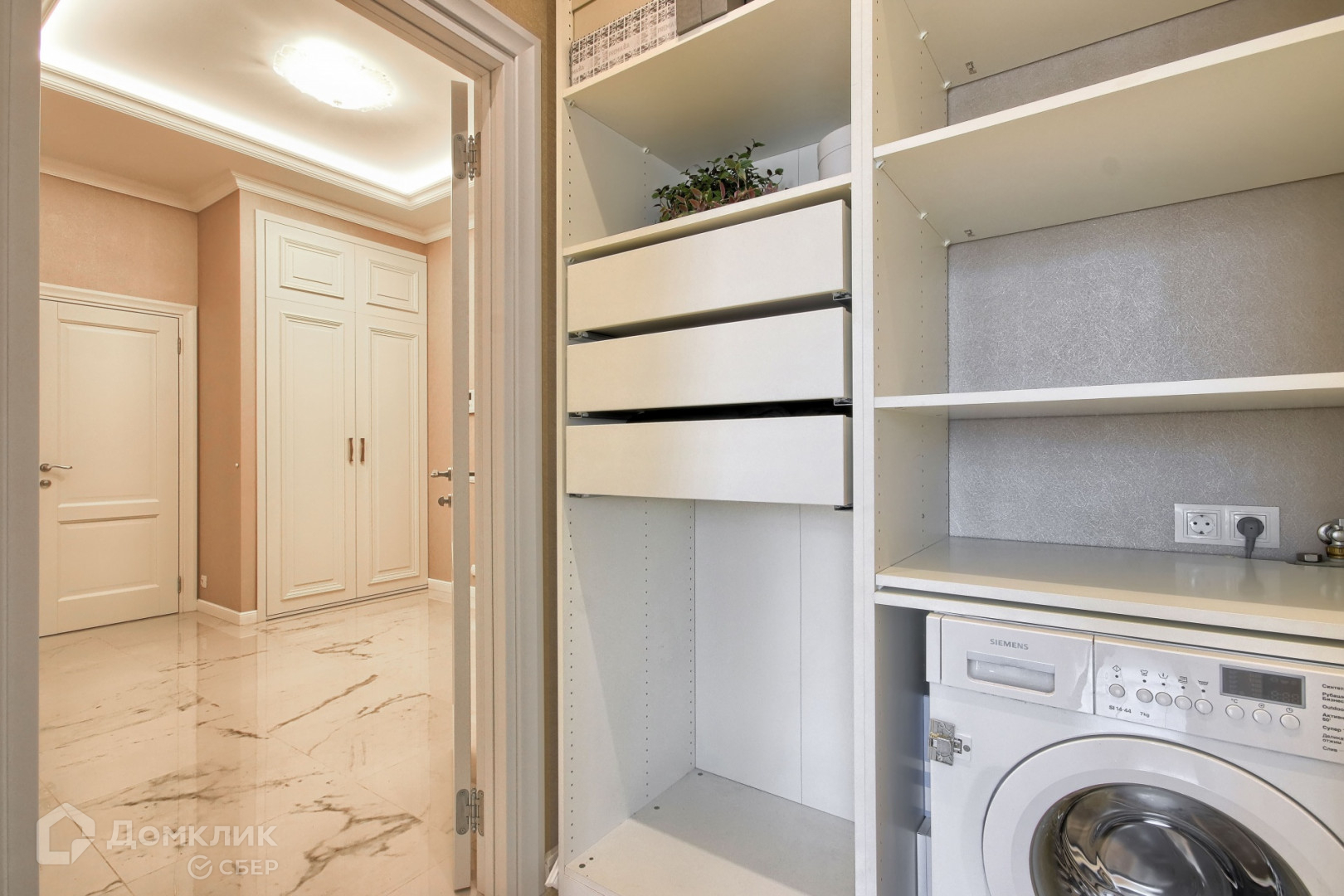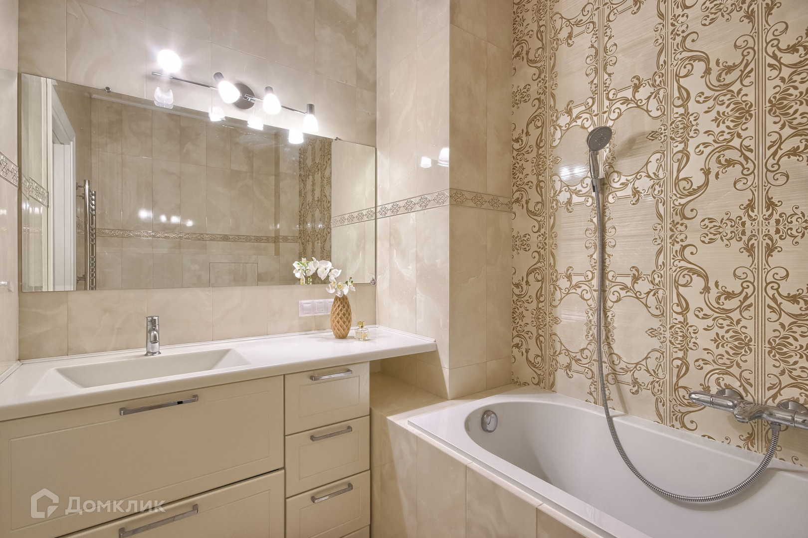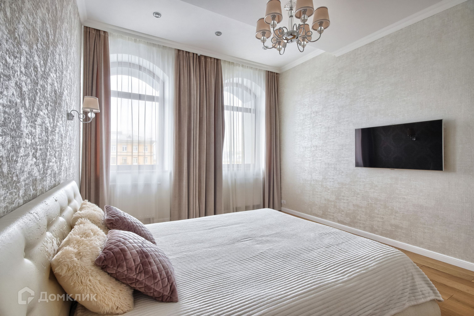 В квартире проведён дизайнерский ремонт: уложен паркет, на стенах европейские обои, хрустальные светильники. Жилая площадь используется с умом: уютная кухня с мебелью на заказ совмещает в себе гостиную, а маленькая прачечная встроена в шкаф. Две просторные комнаты и два санузла с мраморной отделкой позволяют с комфортом проживать даже большой семье.