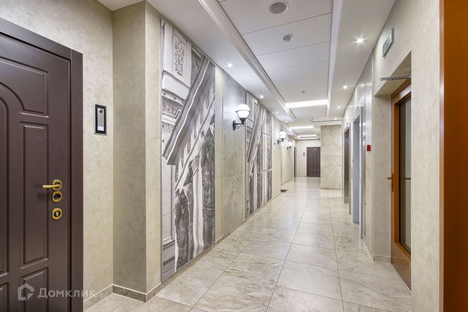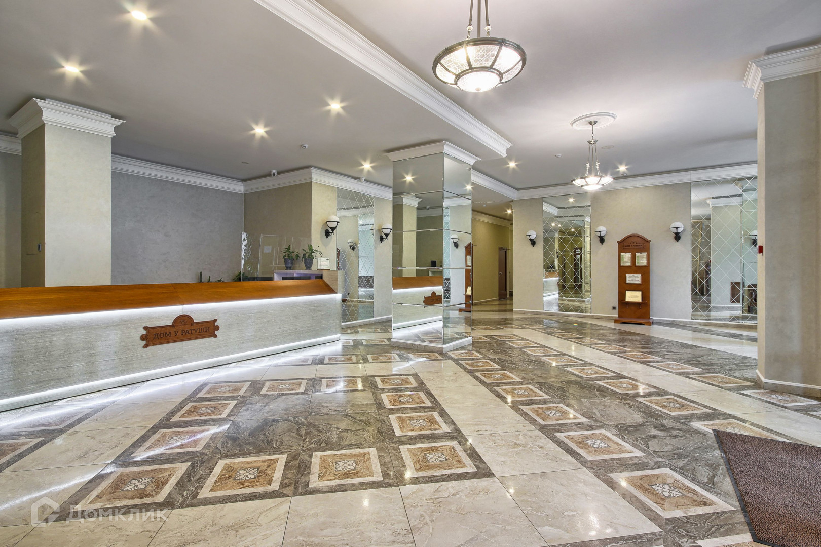 Внутри нас встречает холл в стиле классического Петербурга: натуральный камень, венецианская штукатурка, винтажные люстры. В доме всего 82 квартиры, ощущение простора и тишины.
