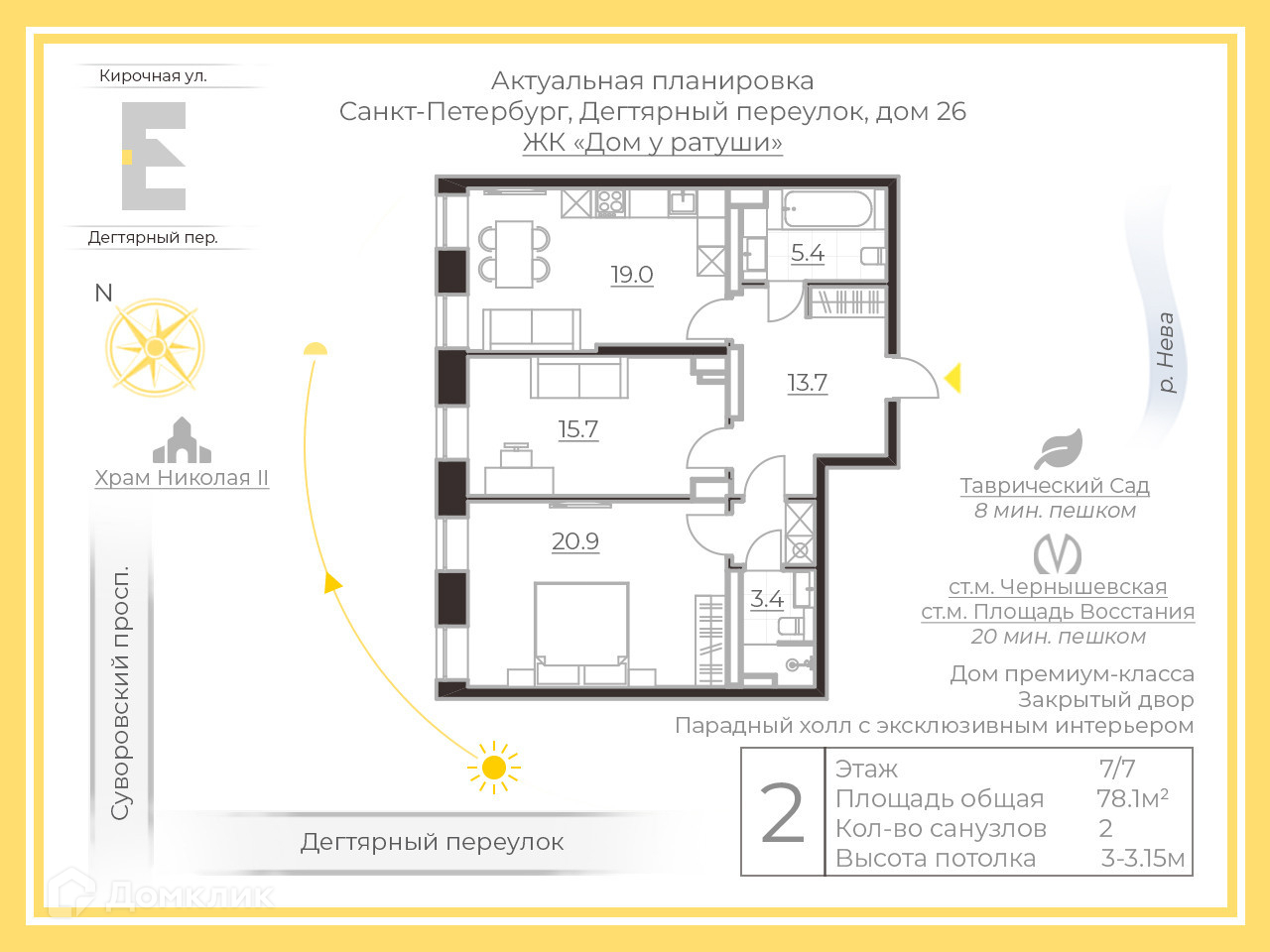 В шаговой доступности от Таврического сада и Смольного собора, в ЖК «Дом у Ратуши» продаётся изящная двухкомнатная квартира на 7 этаже, общей площадью 78.1 м².