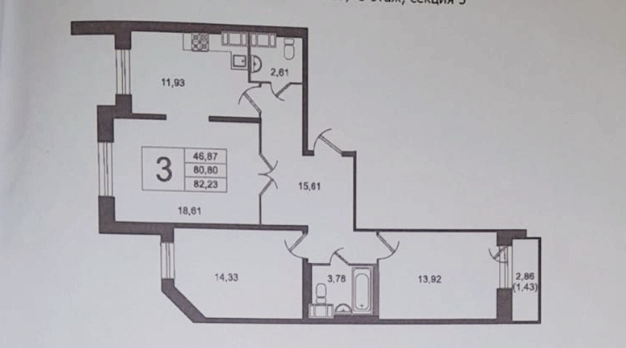 3-комнатная квартира, 83 м2, этаж 3 / 25, на продажу в Санкт-Петербурге, улица Брянцева, 13к1