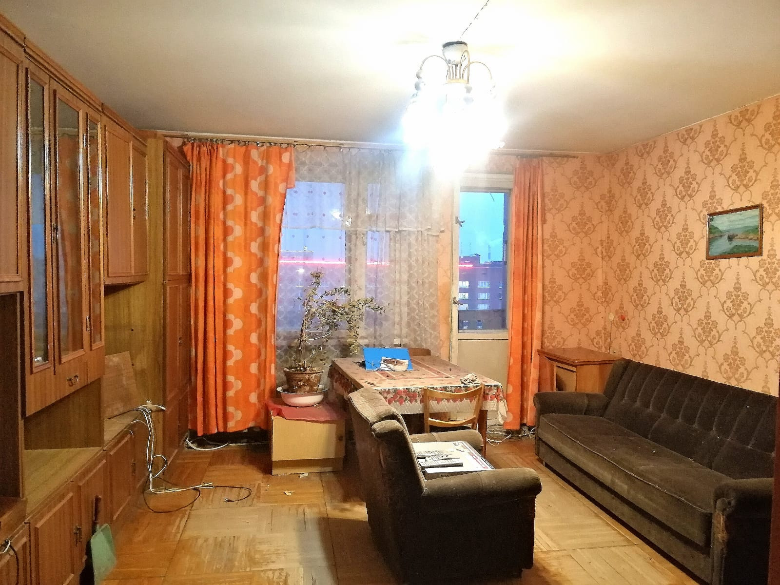 В квартире два балкона. Один - в спальне - выходит на тихий зеленый двор, другой - в гостиной - на улицу и зеленый сквер. Ремонта давно не было, но все коммуникации работают исправно. Можно жить сразу или немного косметически обновить.