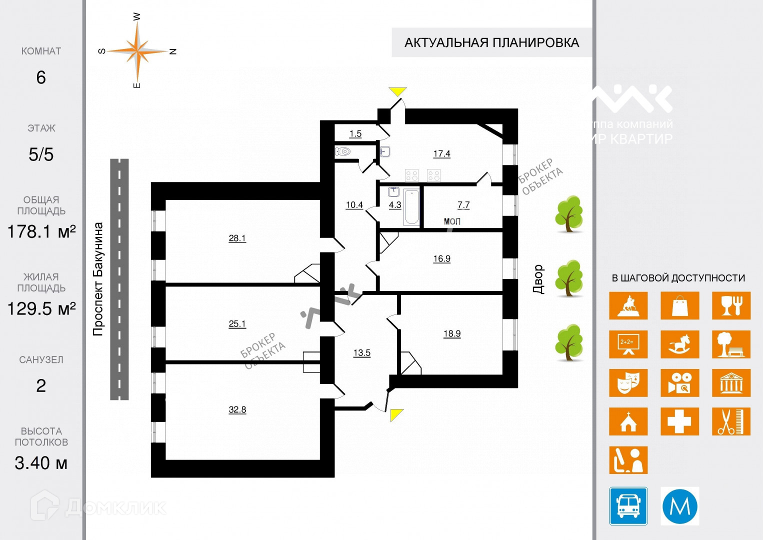 Общая площадь квартиры 178 кв.м, расположена на 5 этаже 5-этажного дома. Идеальная двусторонняя планировка. Окна квартиры выходят на тихую улицу Бакунина, на юго-восток, и в большой зеленый благоустроенный двор с детской и спортивной площадками, на северо-запад. Территория дома находится под видеонаблюдением. Во дворе всегда есть где припарковаться.
