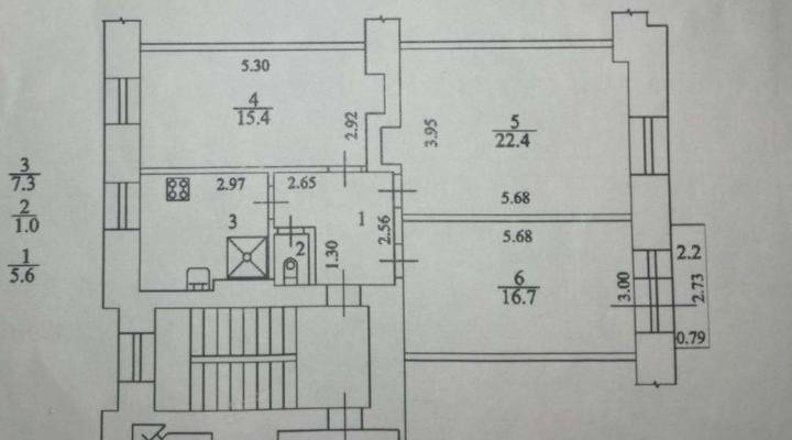 Жилая площадь: 54,5 кв.м. (22,4 кв.м. - 16,7 кв.м. -15,4 кв.м.)