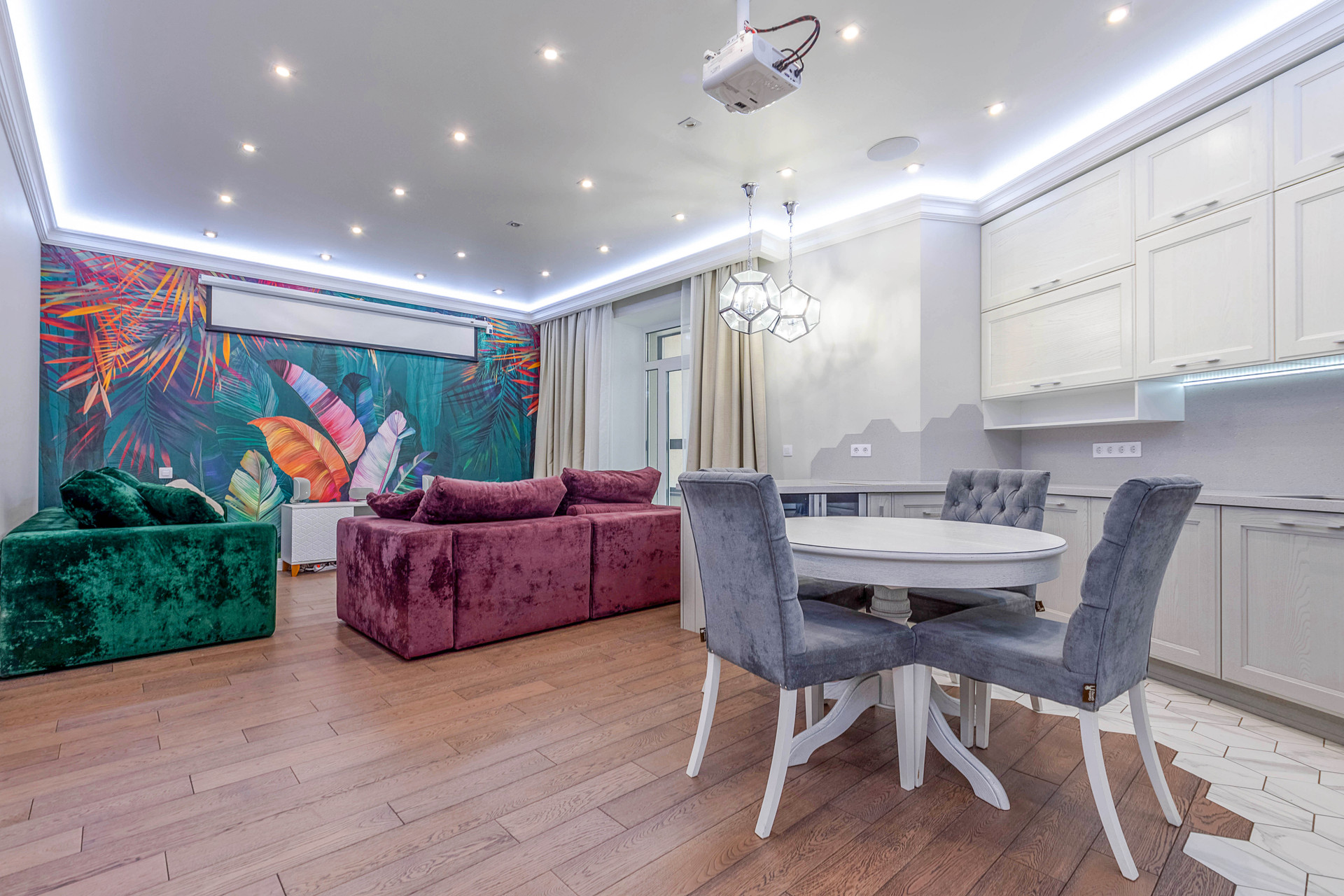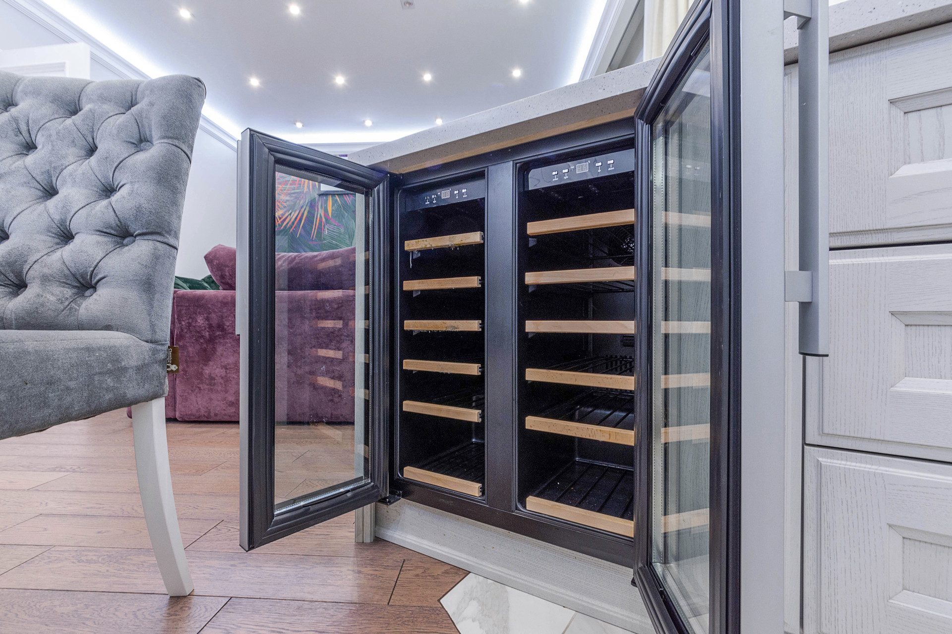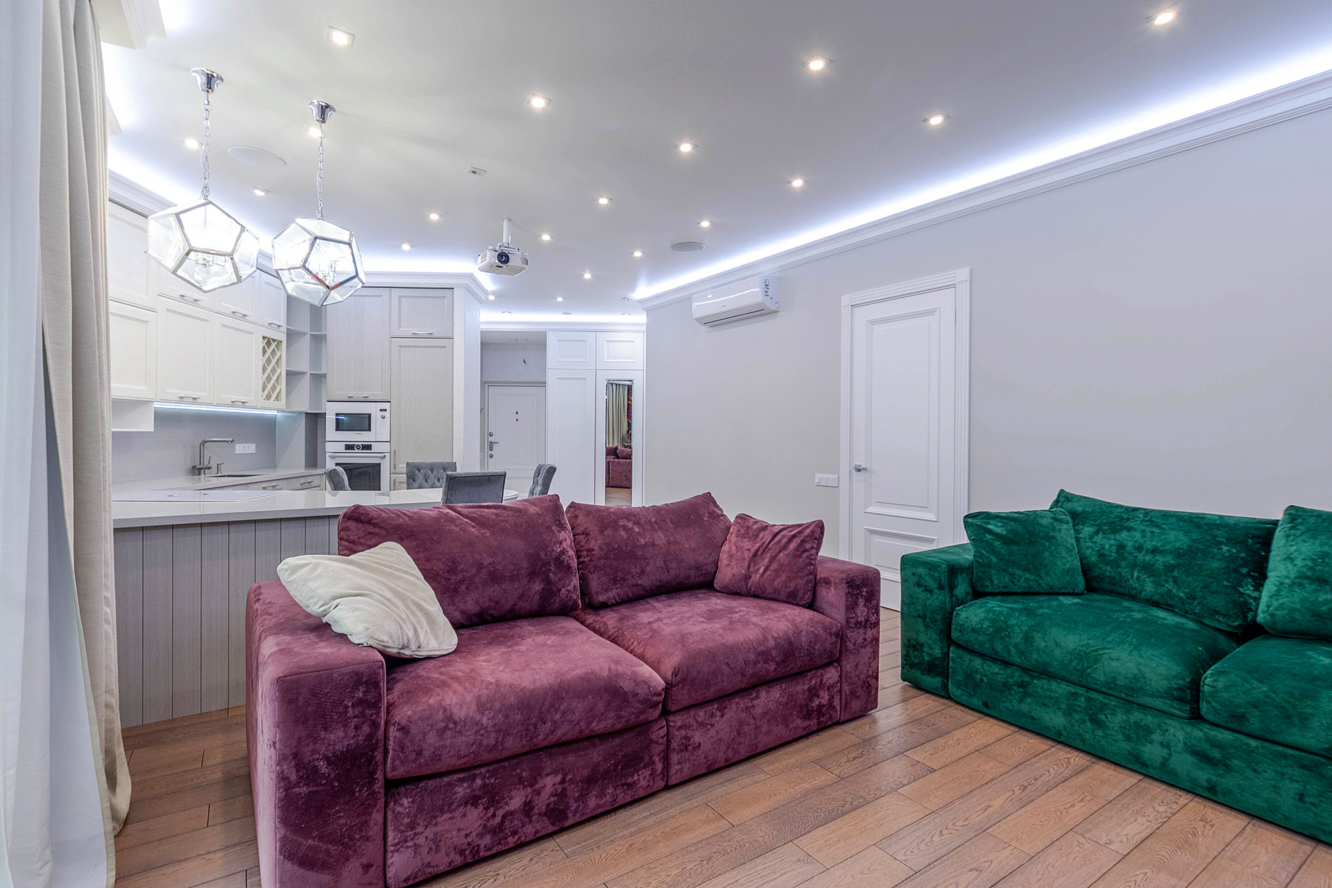 В квартире выполнен дизайнерский ремонт из премиальных материалов: итальянский керамогранит, сантехника - villeroy&bosh, jacob delafon, grohe, напольное покрытие - паркетная доска, кухонная техника - bosch, liebherr, винный холодильник с двумя камерами, варочная панель - elica со встроенной вытяжкой, домашний кинотеатр с акустической системой bowers&wilkins 5.1, потолочная акустика в зале и ванной.