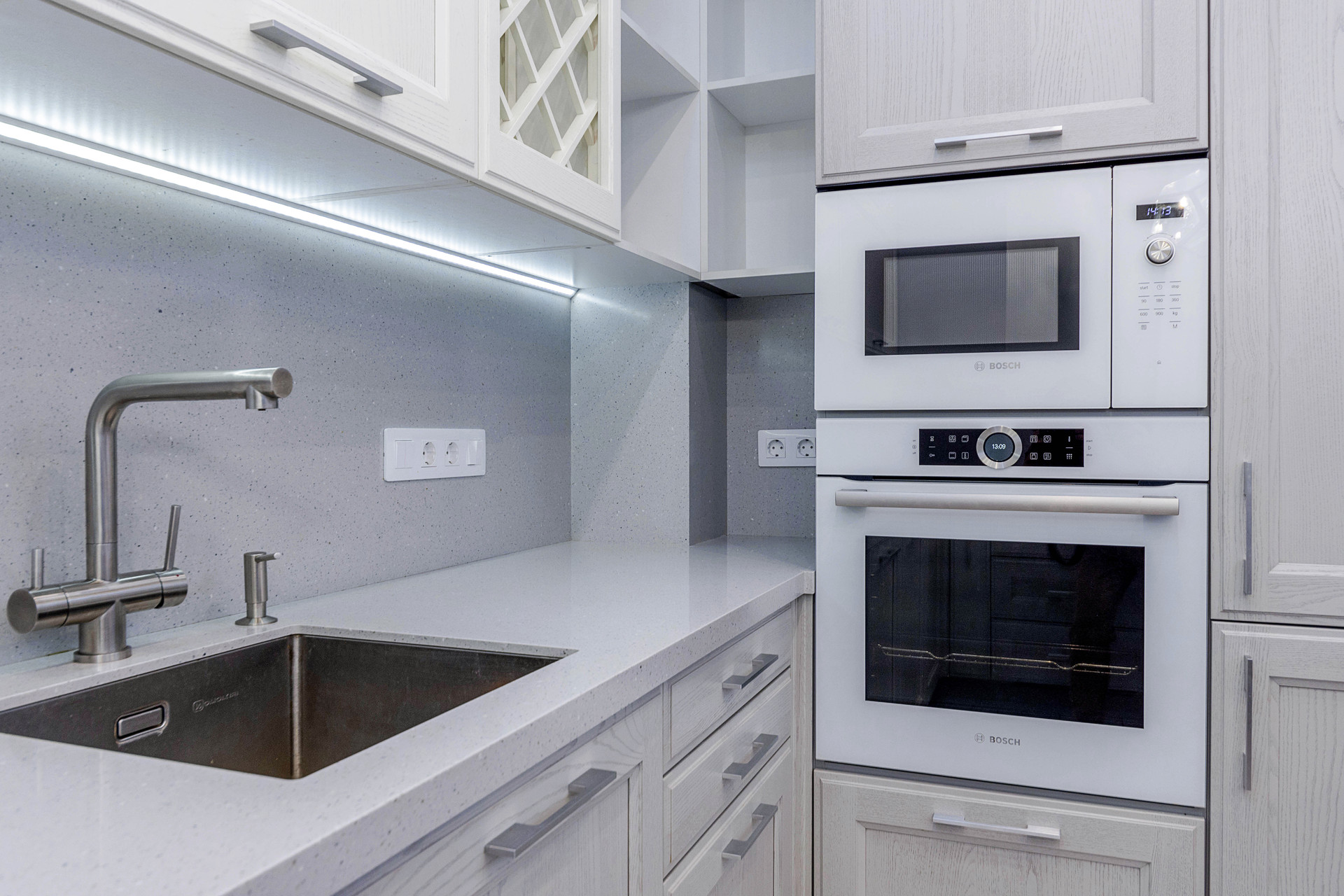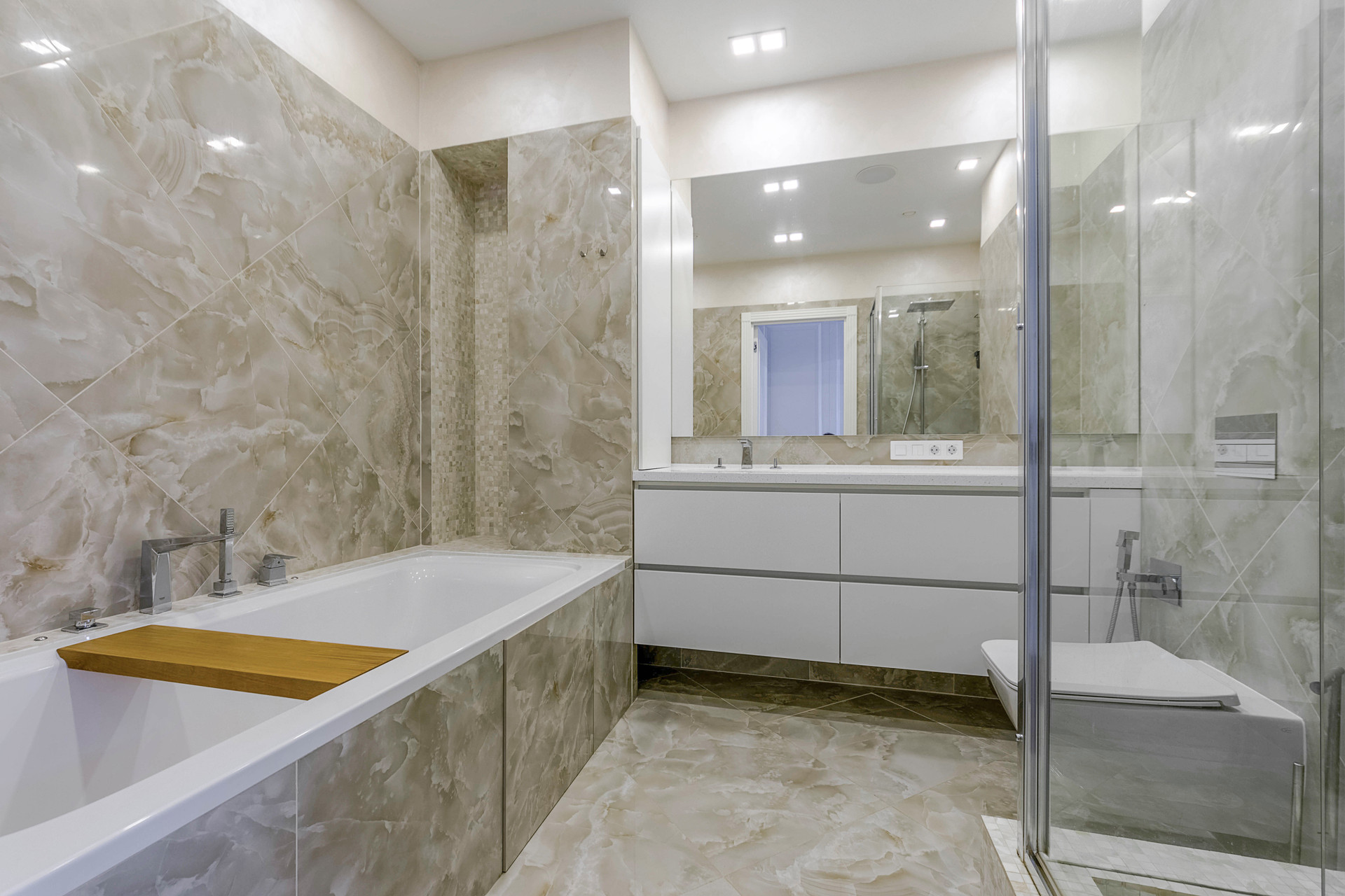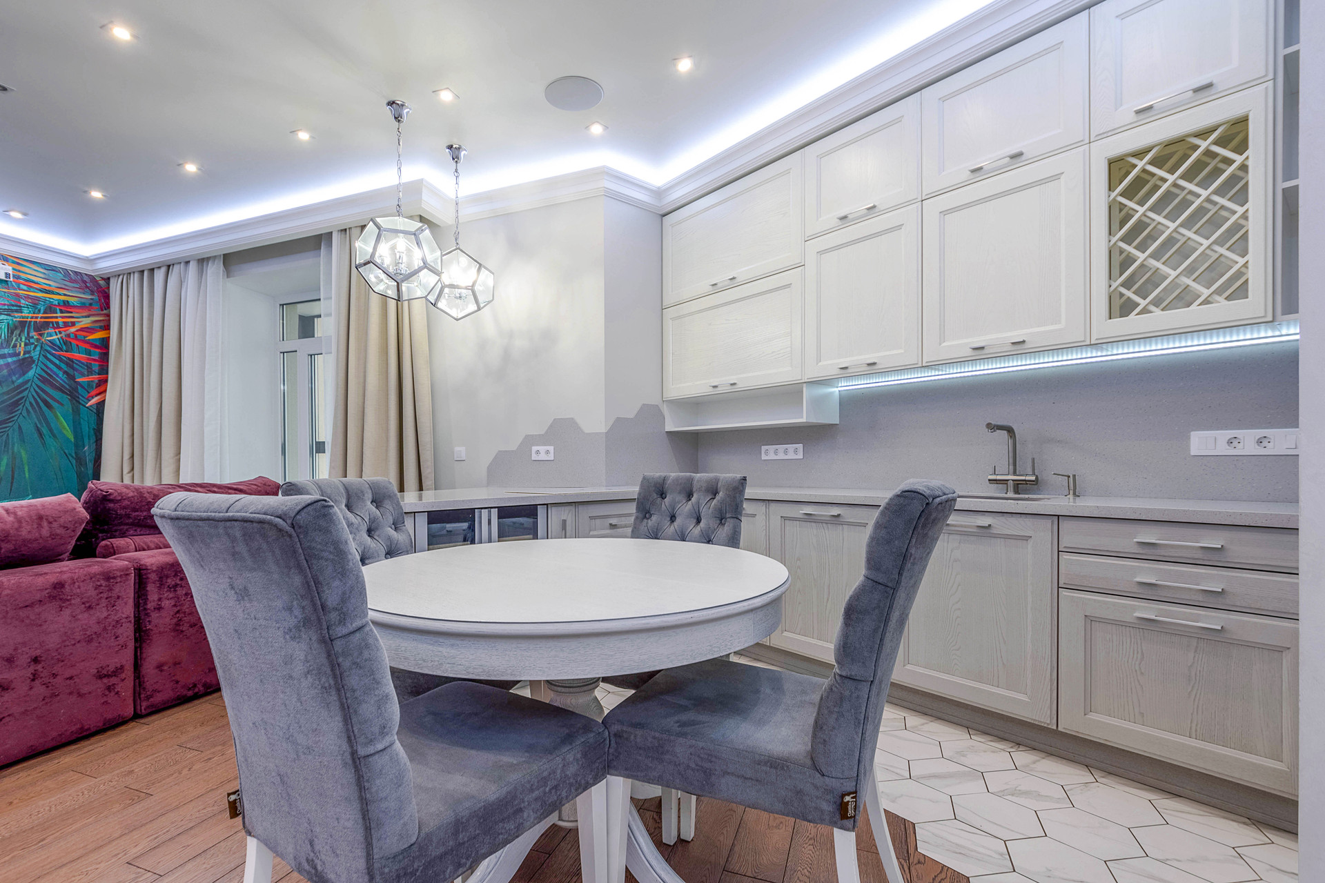 В квартире выполнен дизайнерский ремонт из премиальных материалов: итальянский керамогранит, сантехника - villeroy&bosh, jacob delafon, grohe, напольное покрытие - паркетная доска, кухонная техника - bosch, liebherr, винный холодильник с двумя камерами, варочная панель - elica со встроенной вытяжкой, домашний кинотеатр с акустической системой bowers&wilkins 5.1, потолочная акустика в зале и ванной.