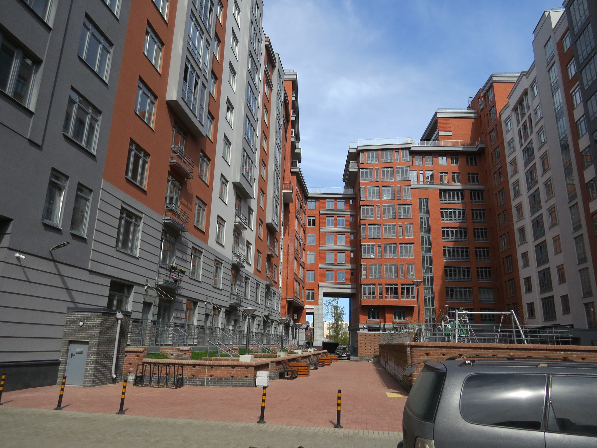 Особую элегантность комплексу придаёт увеличенное остекление квартир, окна смотрят во внутренний закрытый двор, южное направление  благодаря чему в квартире большею часть дня проникает солнечный свет и освещает квартиру.Окна выходят в обустроенный двор. Двор без машин, с детскими площадками и ландшафтным дизайном.