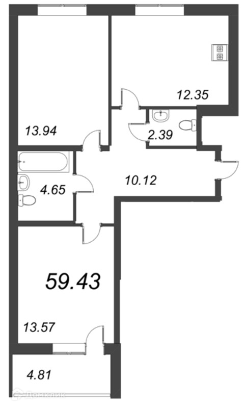 Площадь кухни 12.35 м2