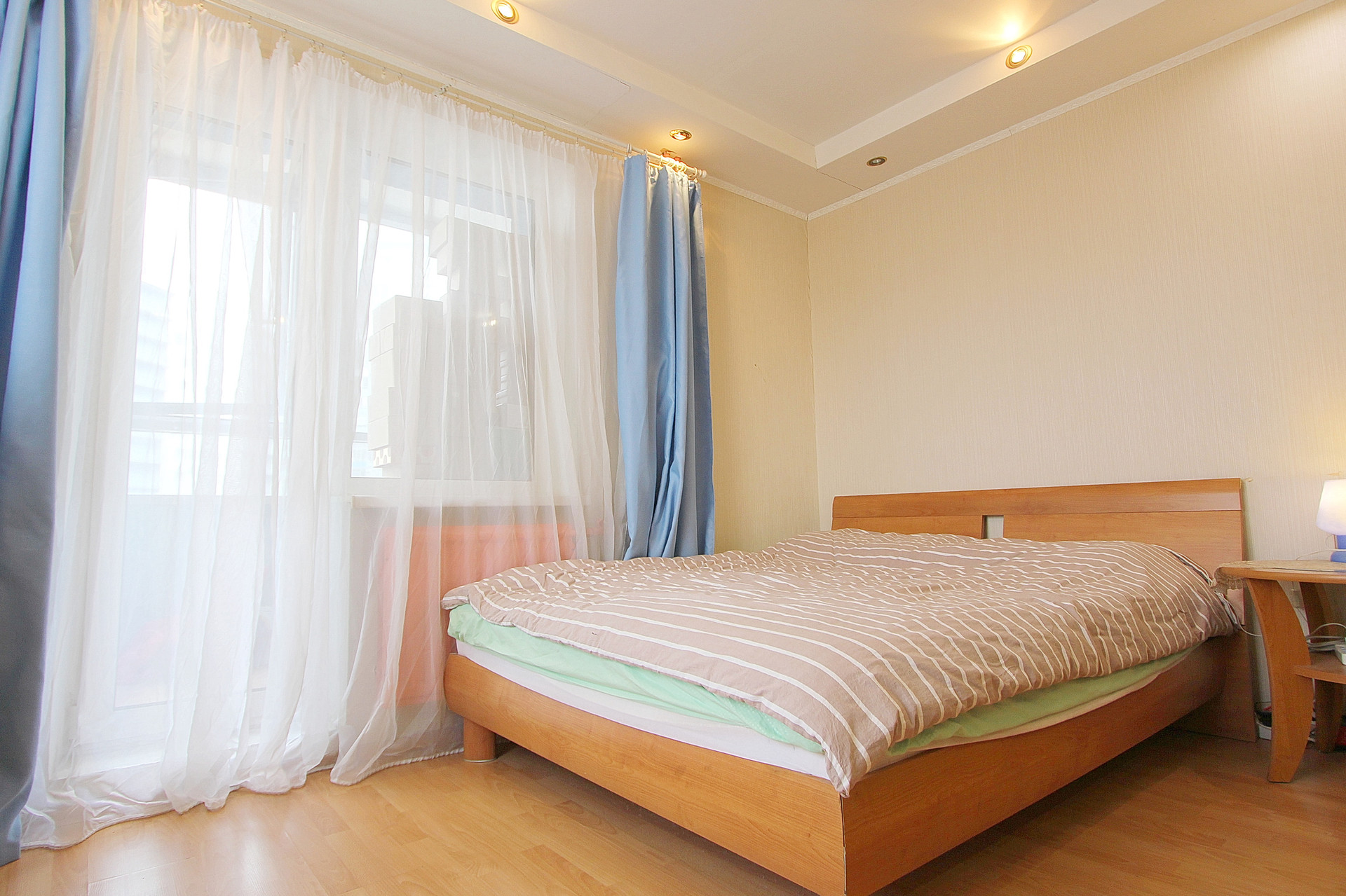 Квартира большая, хорошая шумоизоляция, теплый пол, в комнате 2 окна, одно из которых выходит во двор в стиле “хай-тек”, а второе в сторону гостиницы Прибалтийской.