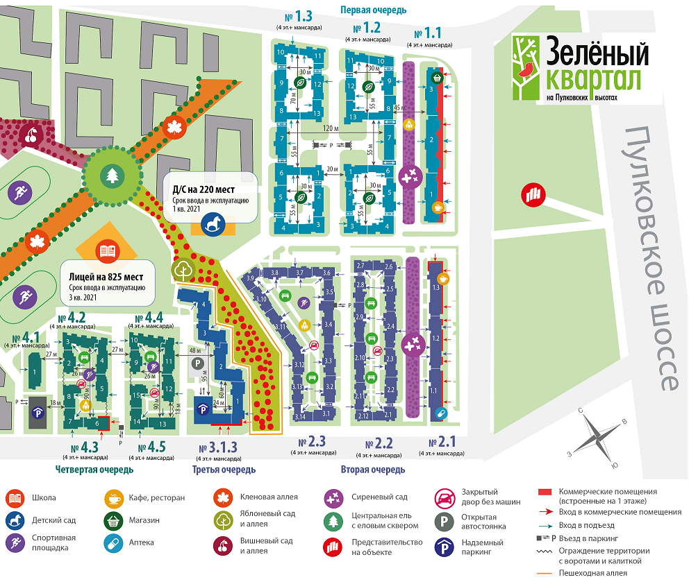 Предусмотрены кленовая, вишневая, яблоневая аллеи и еловый сквер.