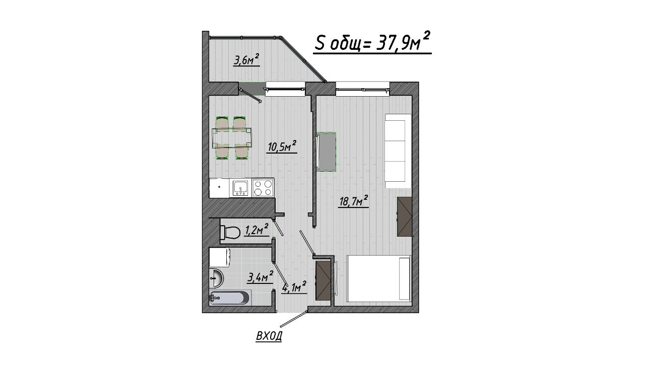 Общая площадь - 37,9 кв.м;