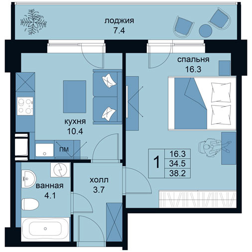 Классическая планировка: кухня 10,4 кв. метра и комната 16,3 кв.м., совмещенный санузел. Выход на просторную застекленную лоджию  7,4 кв.м  из кухни и комнаты. Апартамент полностью укомплектован и готов для быстрого заселения.