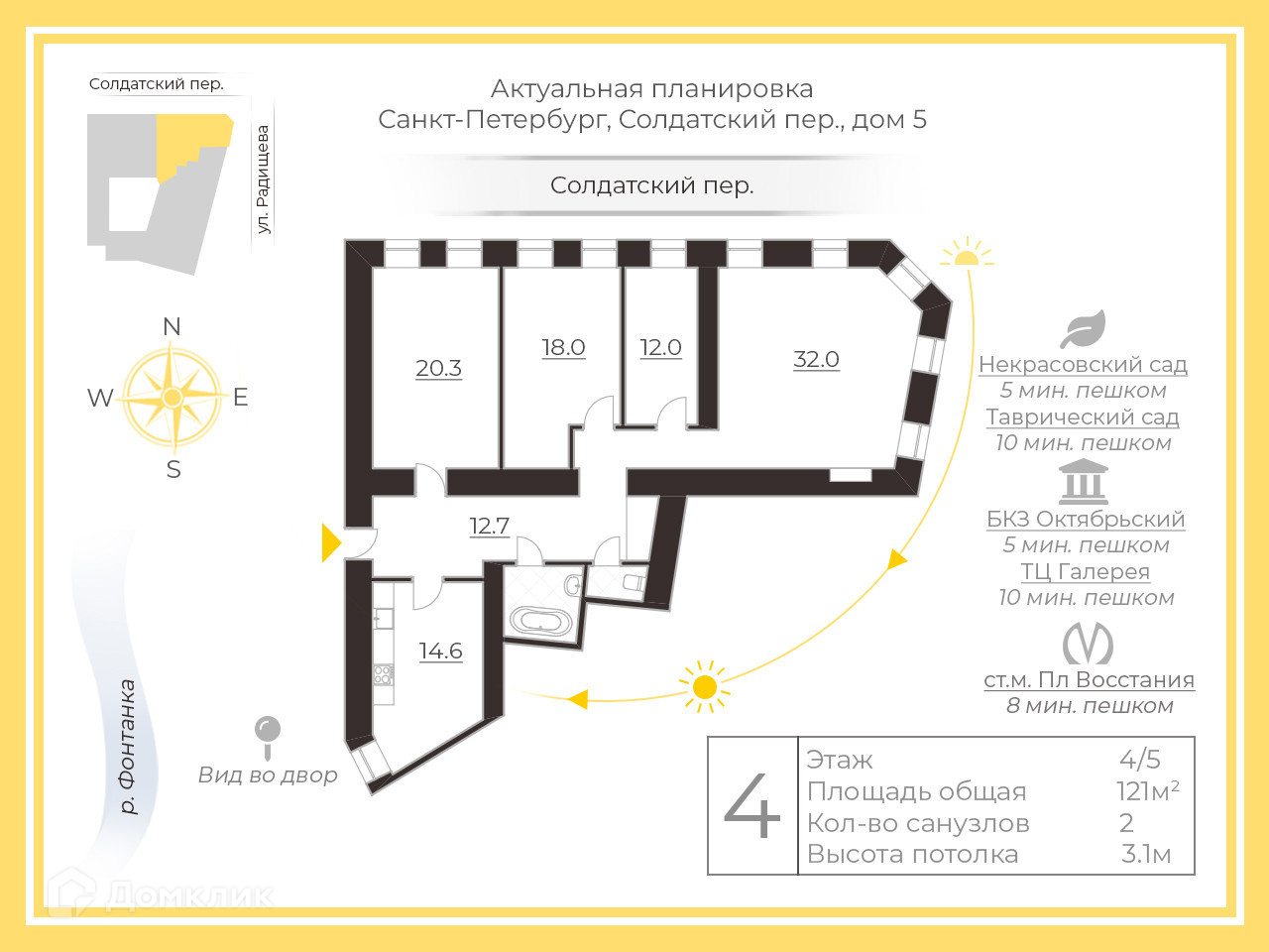 В пешей доступности метро пл. Восстания (6 минут). 5 минут до Некрасовского сада и 15 минут до Таврического сада. До Невского проспекта 8 минут.