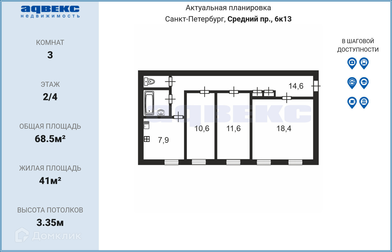 3-комнатная квартира, 68.5 м2, этаж 2 / 4, на продажу в Санкт-Петербурге, Средний проспект Васильевского острова, 6/13