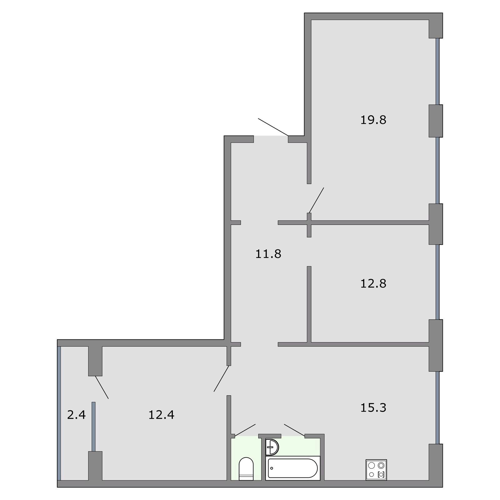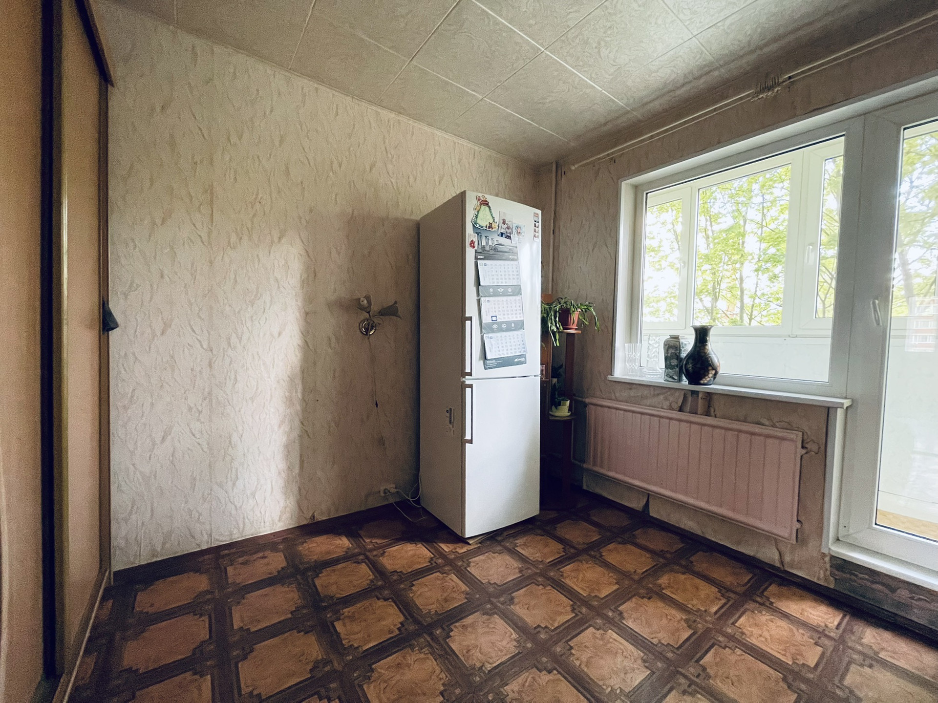 Комфортная для проживания планировка: 3 изолированные комнаты 19,8+12,8+12,4 кв.м., кухня совмещена с коридором 15,3 кв.м., раздельный санузел 1+2,7 кв.м., остеклённая лоджия 2,4 кв.м. (окна лоджии выходят в зелёный двор на Юг, окна комнат и кухни - на Восток), коридор с нишами для гардеробных. Квартира требует ремонта.