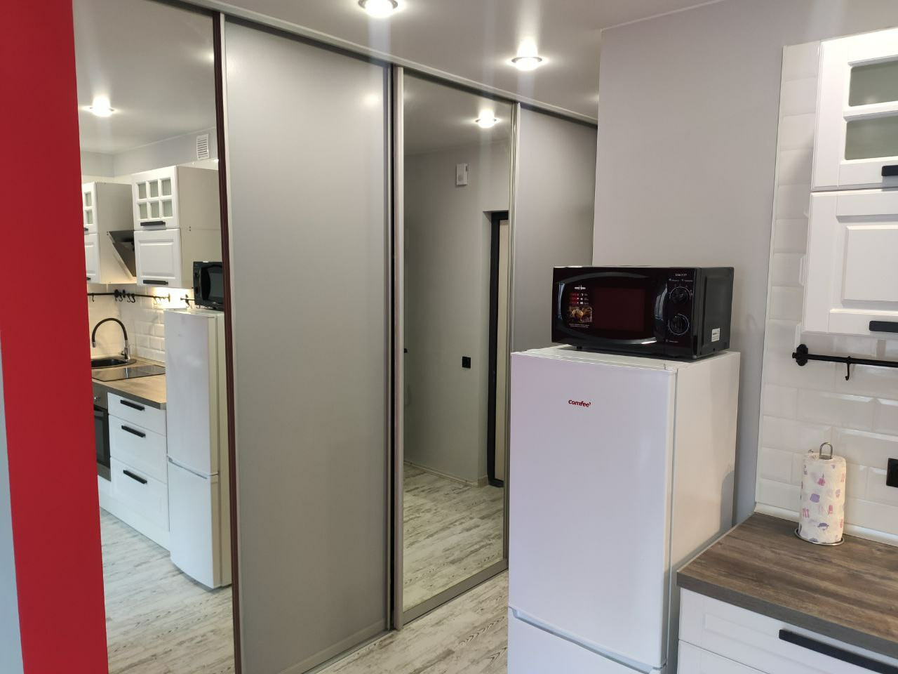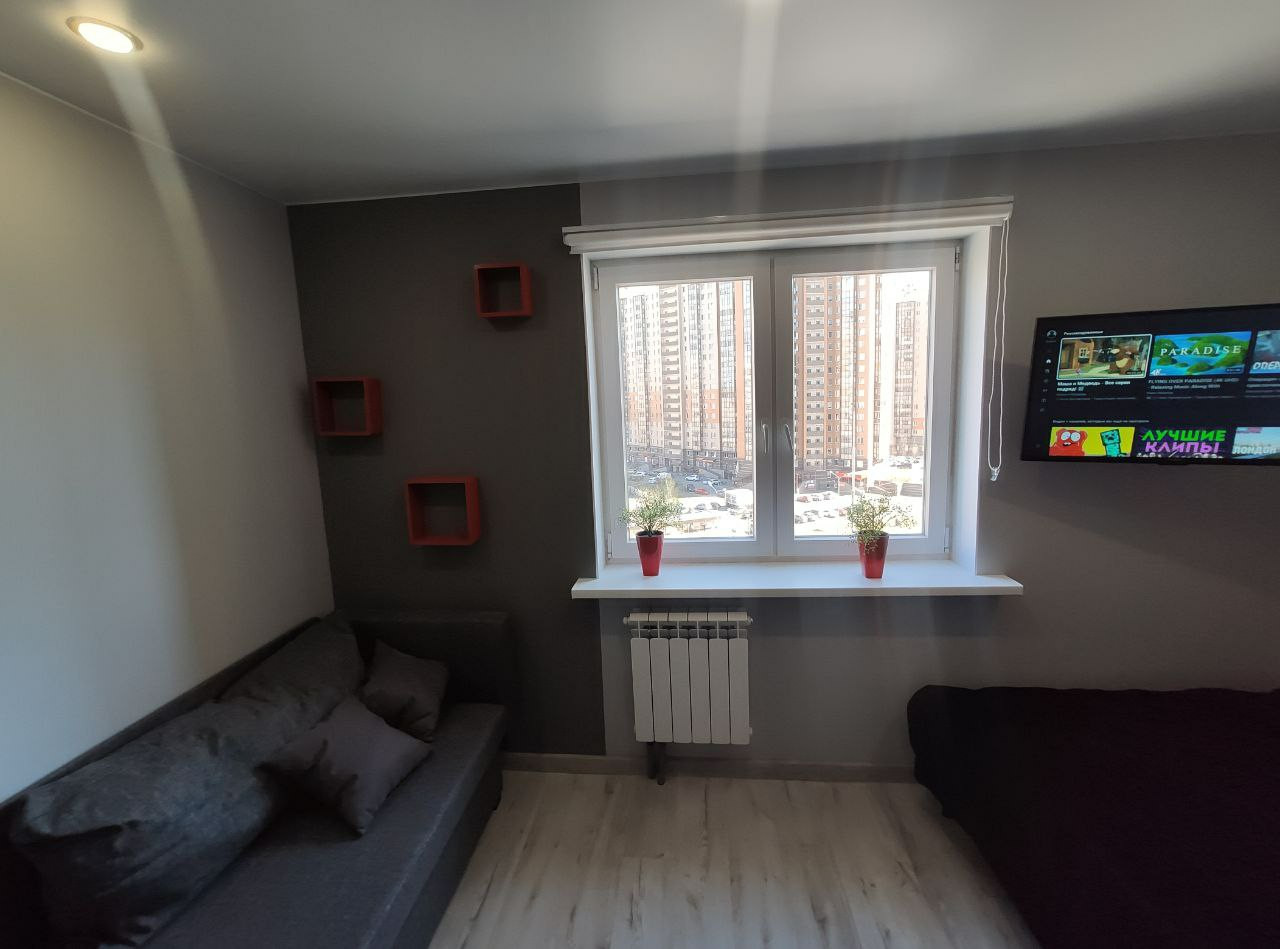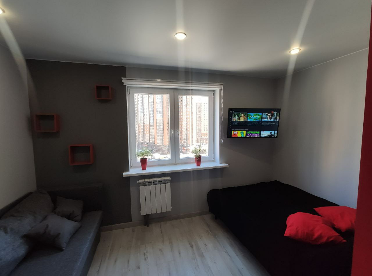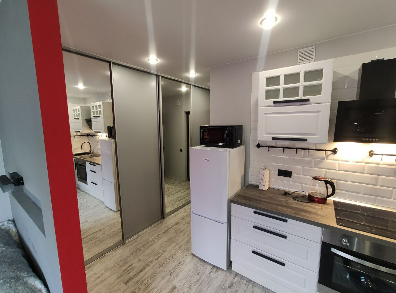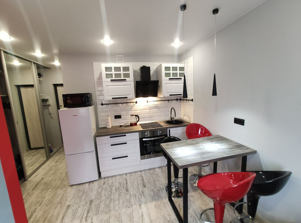 Шикарная квартира студия с дизайнерским ремонтом. Квартира разделена на спальную, гостиную и обеденные зоны.Вся мебель и техника входит в стоимость. Кухня Метод Икея,гарантия 25 лет. Отличного качества межкомнатные финские двери покрытые эмалью фирмы Jeld Wen гарантия 20 лет. Теплые полы из керамогранита в коридоре и санузле на двух терморегуляторах. Можно включать по отдельности.  Стены окрашены финской краской Tikkurila. Встроенный зеркальный шкаф длиной 3 метра, разместит все Ваши вещи. Полы высокопрочный ламинат Epi/ Alsaflor 33 класса производства Франции . Натяжные потолки матовые и глянцевые производства ФирмыPONGS, которая производит свой первоклассный текстиль для тканевых натяжных потолков исключительно на заводе Mhltroff в Германии.   Установлена кровать 1600 с ортопедическим матрасом Икея, гарантия 25 лет.