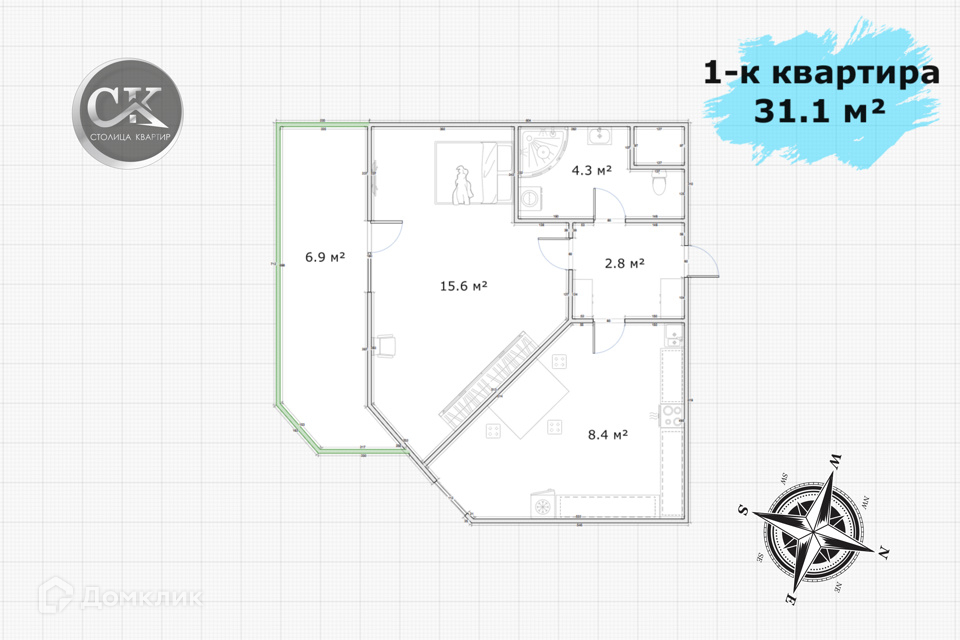 • Общая площадь 31.1 м²