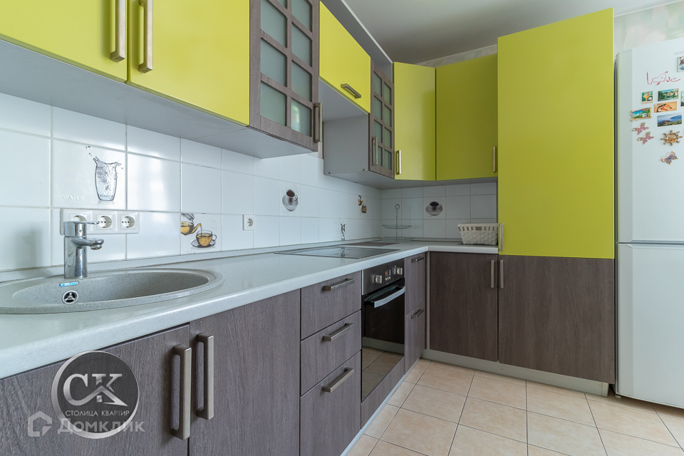 • На кухне встроенная техника и мебель под заказ, холодильник.