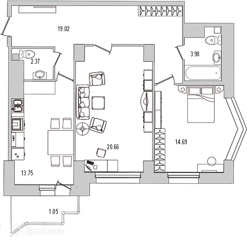 Жилая площадь 34.8 м2
