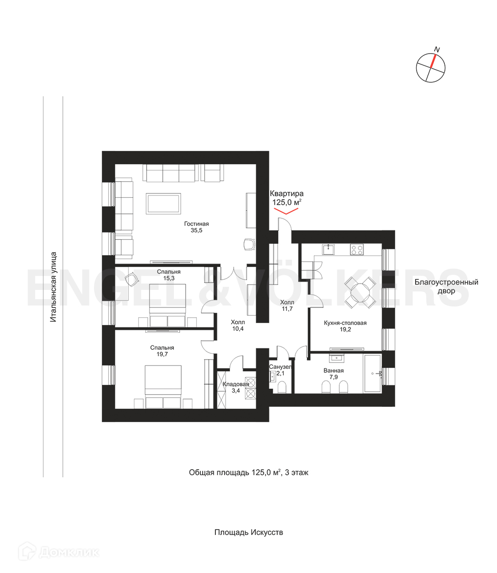 Квартира общей площадью 125 кв. м выполнена в классическом стиле, обладает двухсторонней планировкой и включает в себя: гостиный зал, две спальни, столовую со встроенной кухней, основную ванную комнату, гостевой санузел, кладовую, холл-прихожую с гардеробом. Из фасадных окон открывается вид на перспективу Итальянской улицы в стороны пл. Искусств и наб. канала Грибоедова. В наличии системы приточно-вытяжной вентиляции и кондиционирования, фильтрации воды, подогрев пола, полное техническое оснащение кухни, наборный паркет с художественным оформлением.