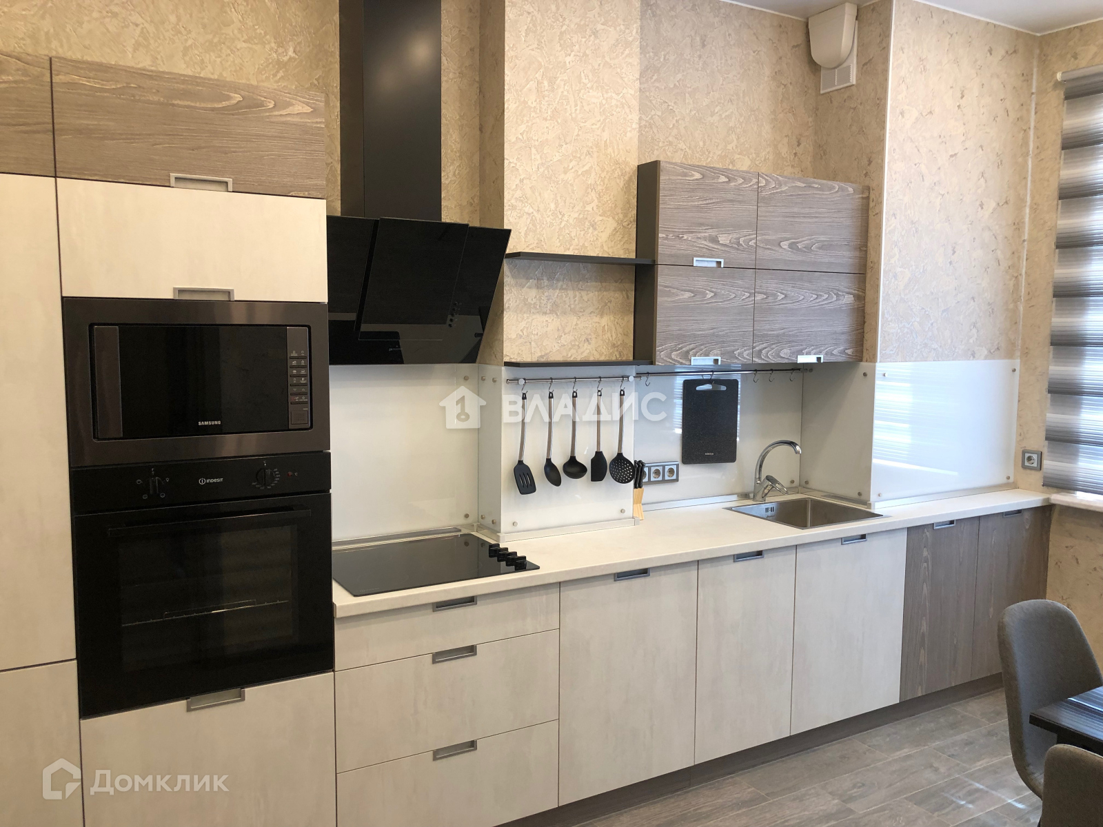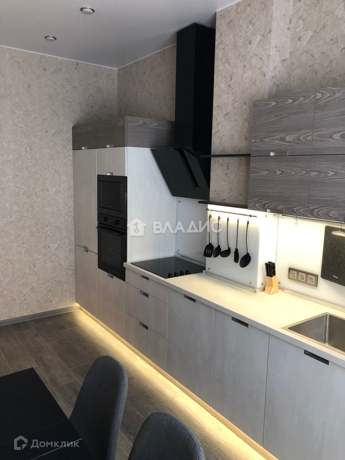 Современная встроенная кухня со всей техникой (варочная панель, духовой шкаф, посудомоечная машина, вытяжка микроволновая печь, холодильник, TV)Высокие потолки добавляют пространства.
