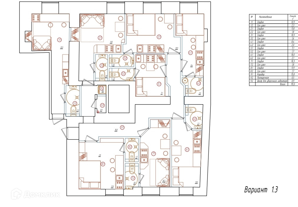 Площадь студий: 15,2+13,6+12,5+10,4+9,6+12,1+12,1+13,6