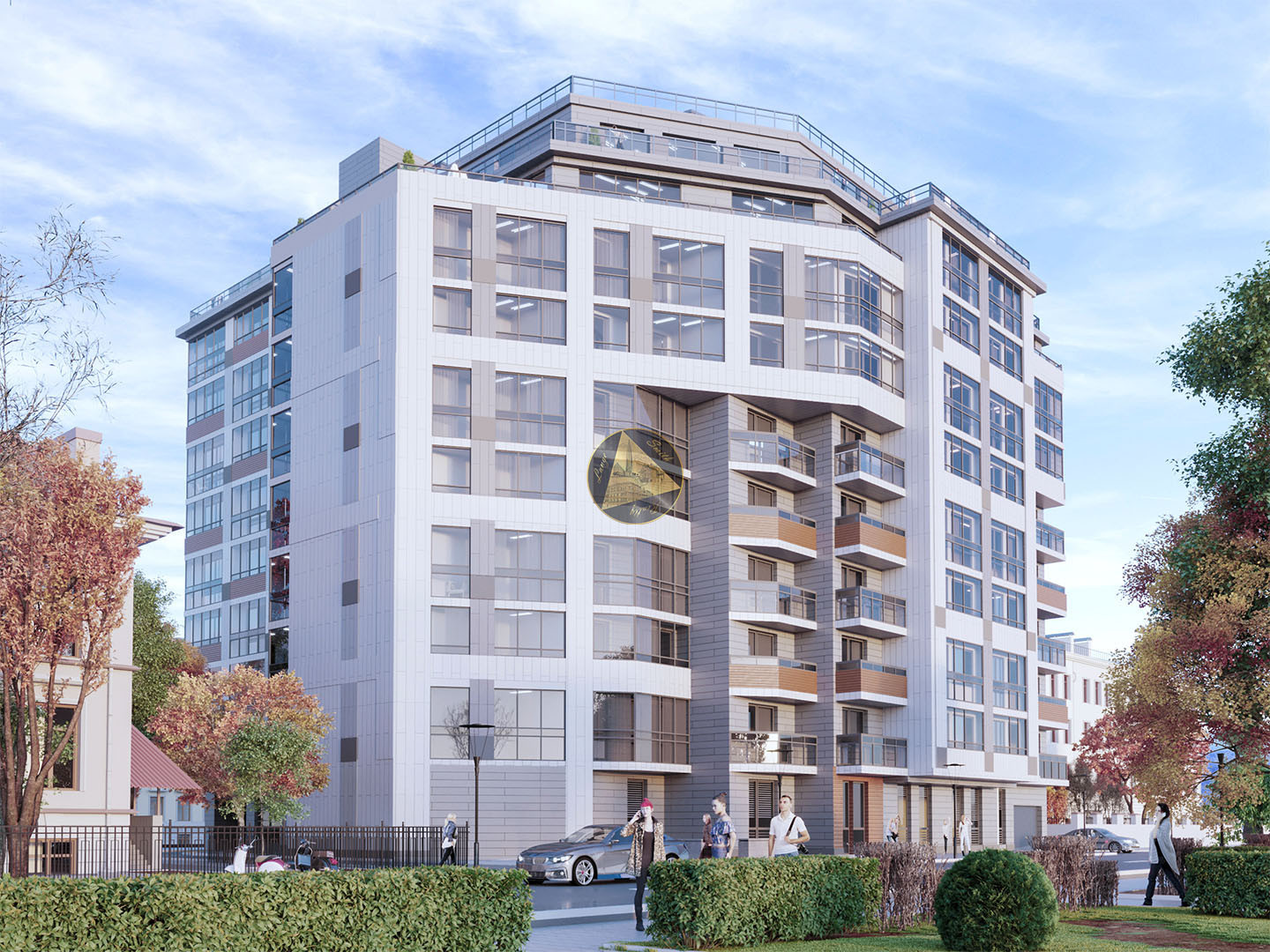 - Апартаменты занимают 2-10 этажи, на 1 этаже лобби и служба быта, конференц-зал, фитнес-клуб, кафе и магазины, на 0 этаже предусмотрен подземный паркинг на 80 автомобилей и гостевая автостоянка на 10 машиномест.