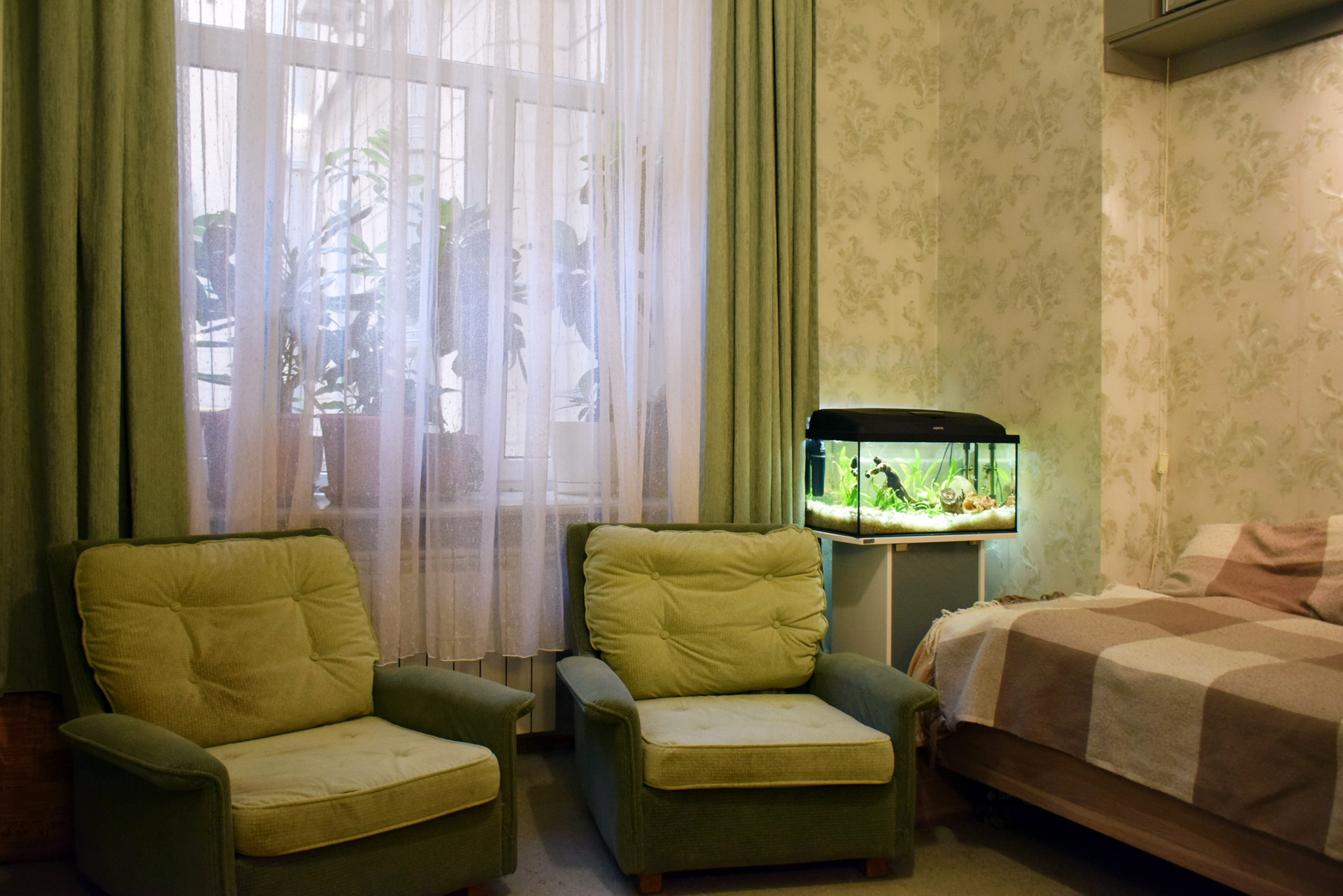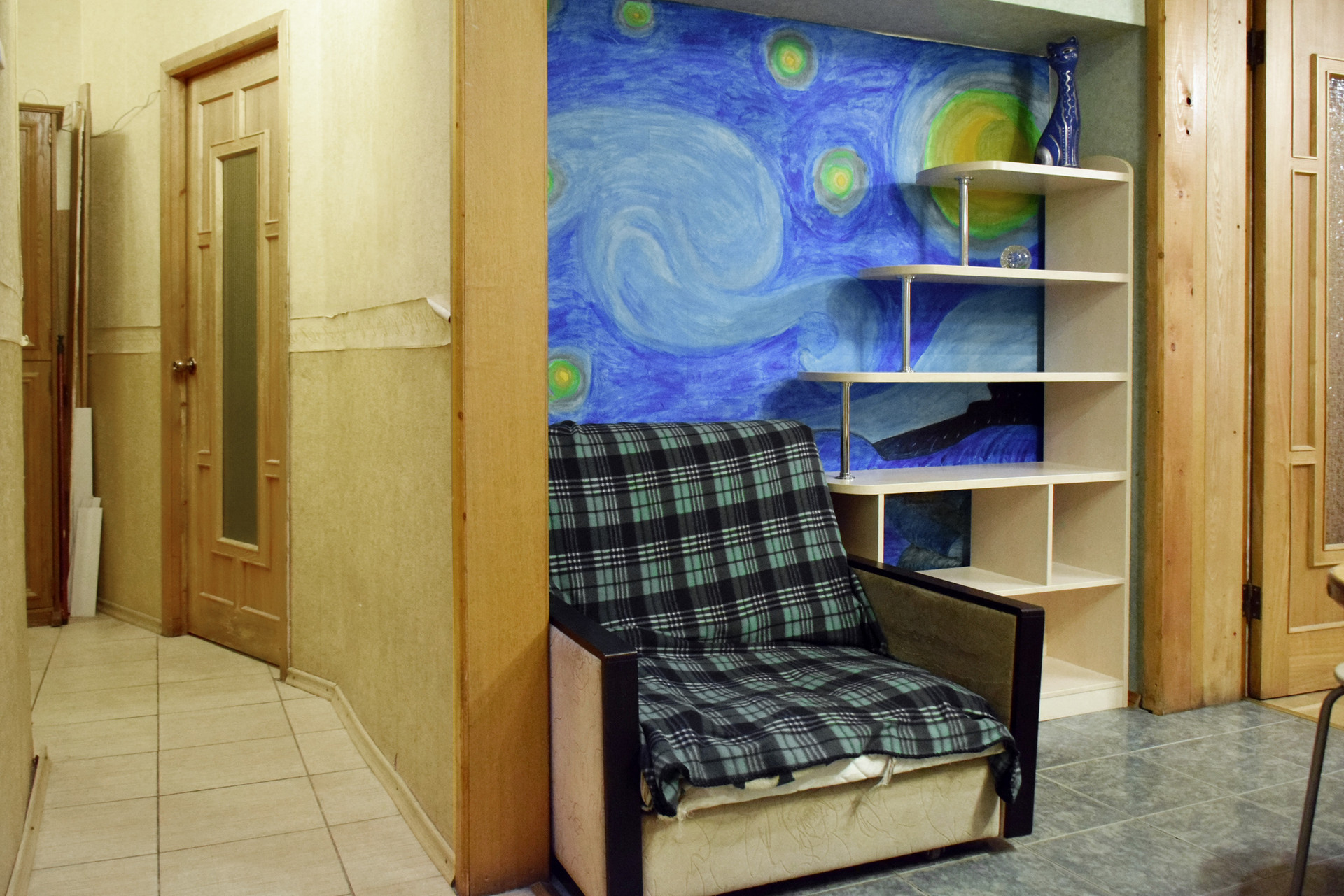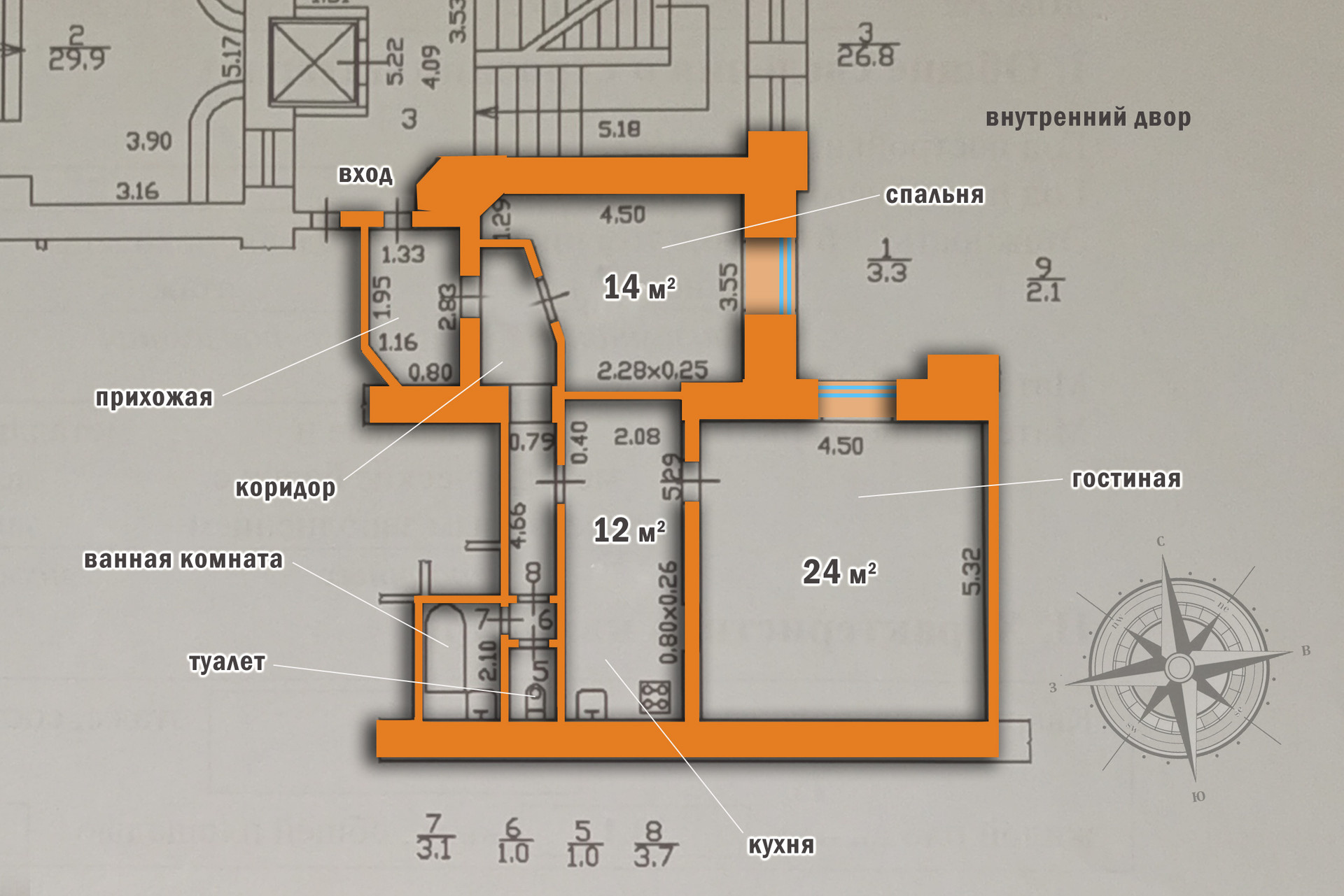 12-метровая кухня, плита газовая. Изолированные комнаты 14 + 24 кв.м, большие окна в закрытый внутренний дворик, стеклопакеты, широкие подоконники. Антресоли в спальне. В квартире очень тихо - идеально для тех, кто ценит уединение и спокойствие.