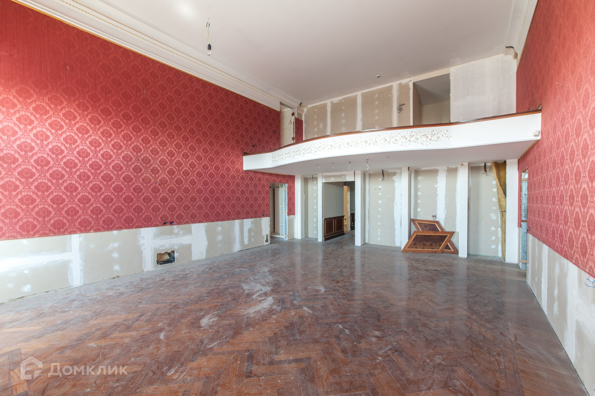 Состояние квартиры под ремонт. При этом сохранились и исторические детали, такие наборный паркет, текстильные обои, камин в гостиной.