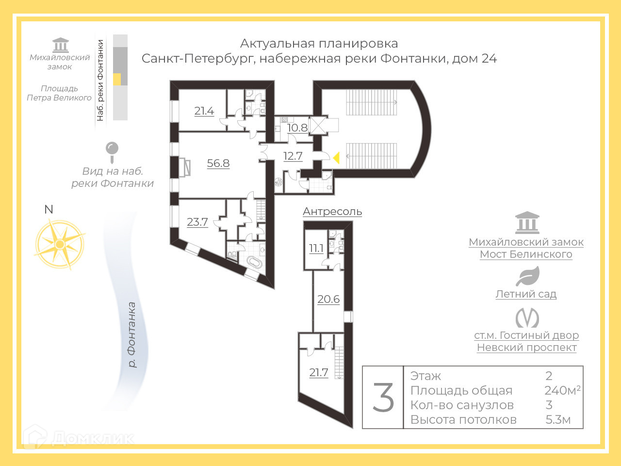 4-комнатная квартира, 240.5 м2, этаж 5 / 5, на продажу в Санкт-Петербурге, набережная реки Фонтанки, 24