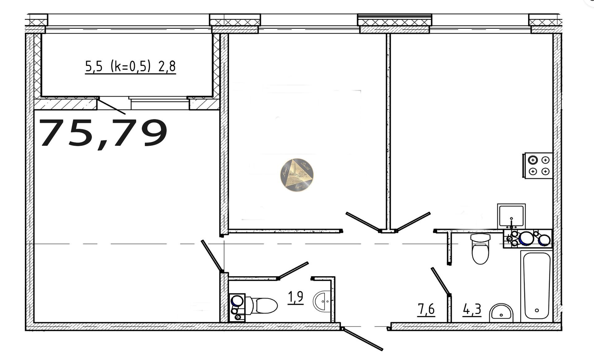 Квартира находится на 6 / 10  этаже. Общая площадь квартиры 75,79 м2. Большая и функциональная кухня-гостиная 18.3 м2. Спальня 17.8 м2. Гостиная 22.2 м2. Общая жилая 40 м2. Санузел 1.9 + 4.3 м2. Лоджия 5.5 м2.