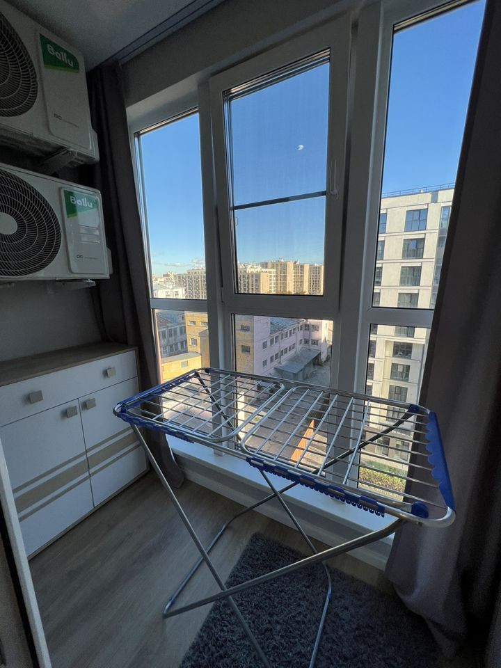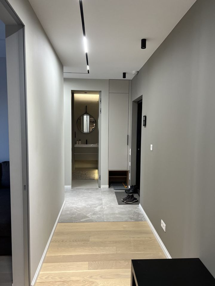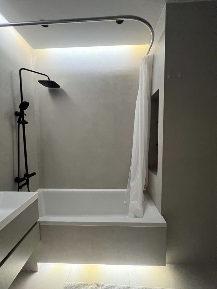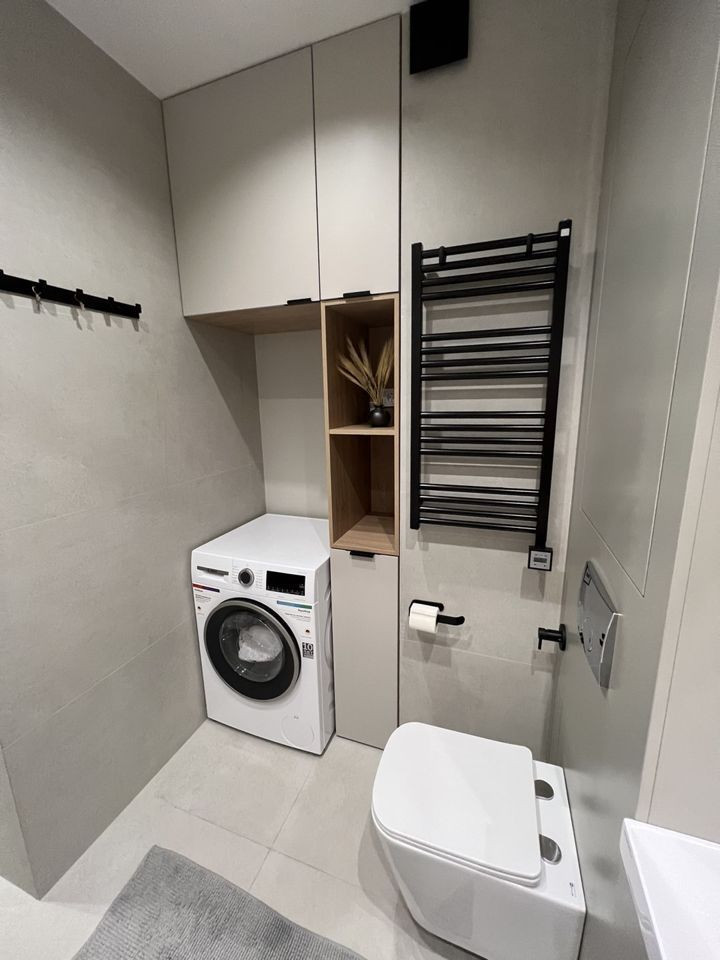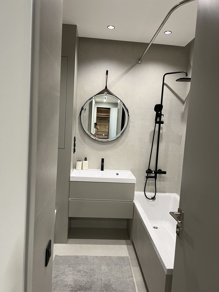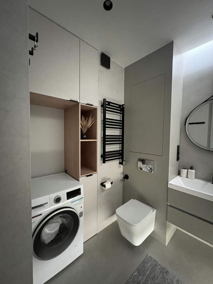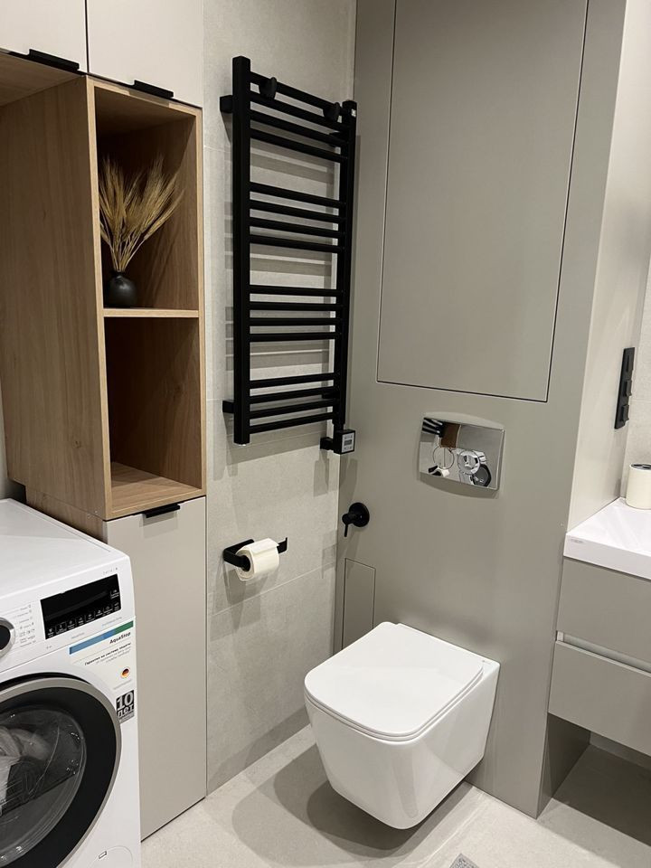 - Санузел совмещенный. Установлены стиральная машина, проточный водонагреватель (работает на все смесители в квартире при отключении горячей воды), теплые полы с управлением по Wi-Fi.