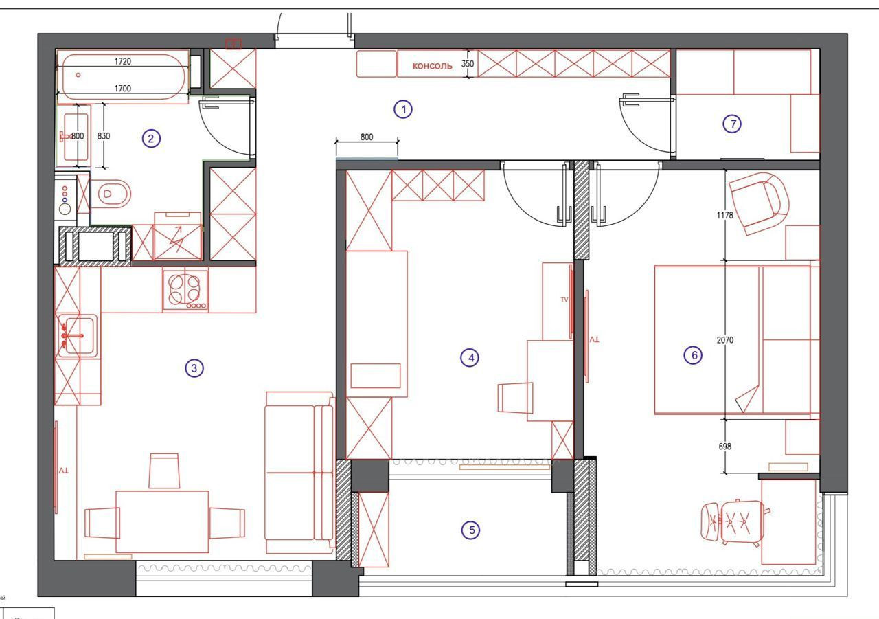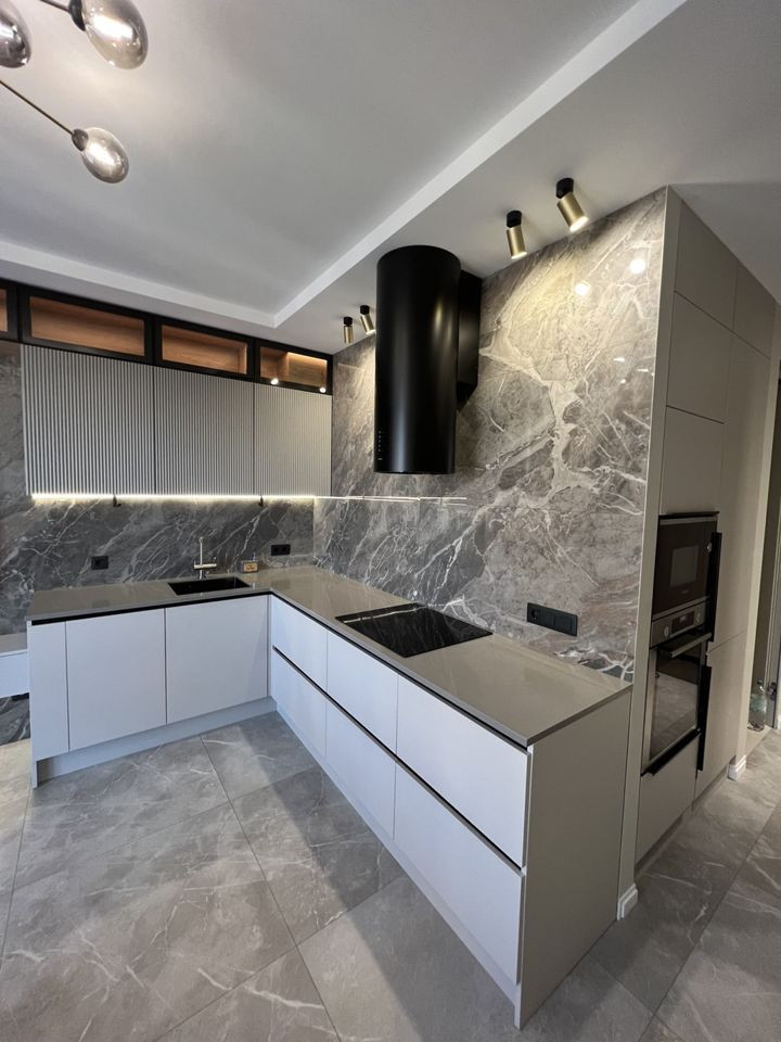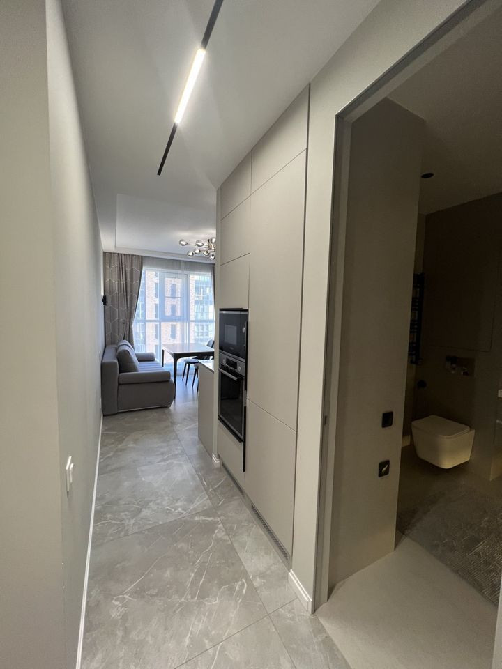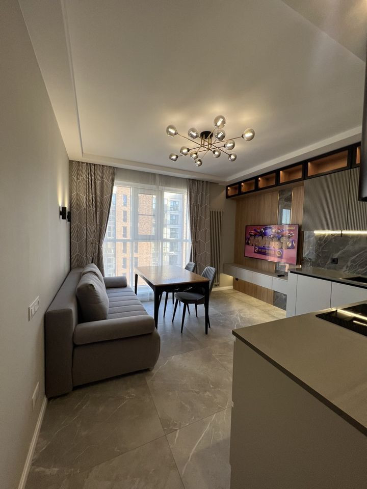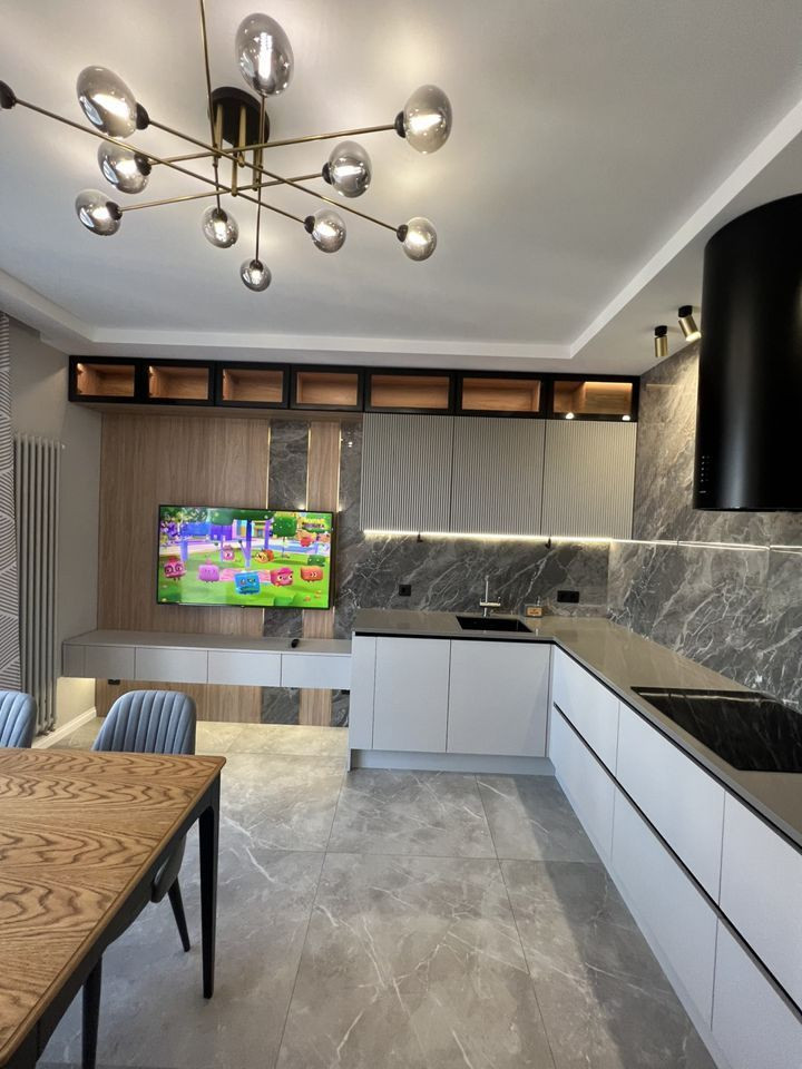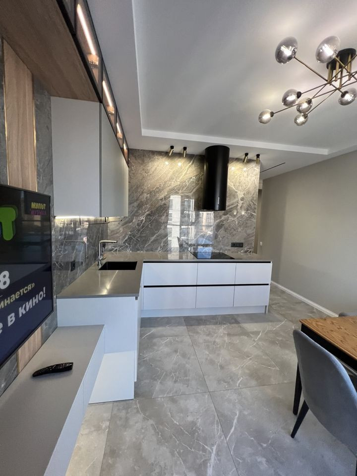 - Кухня со всей необходимой бытовой техникой (холодильник, свч печь, духовой шкаф, плита, посудомоечная машина, вытяжка, телевизор, фильтр для питьевой воды).