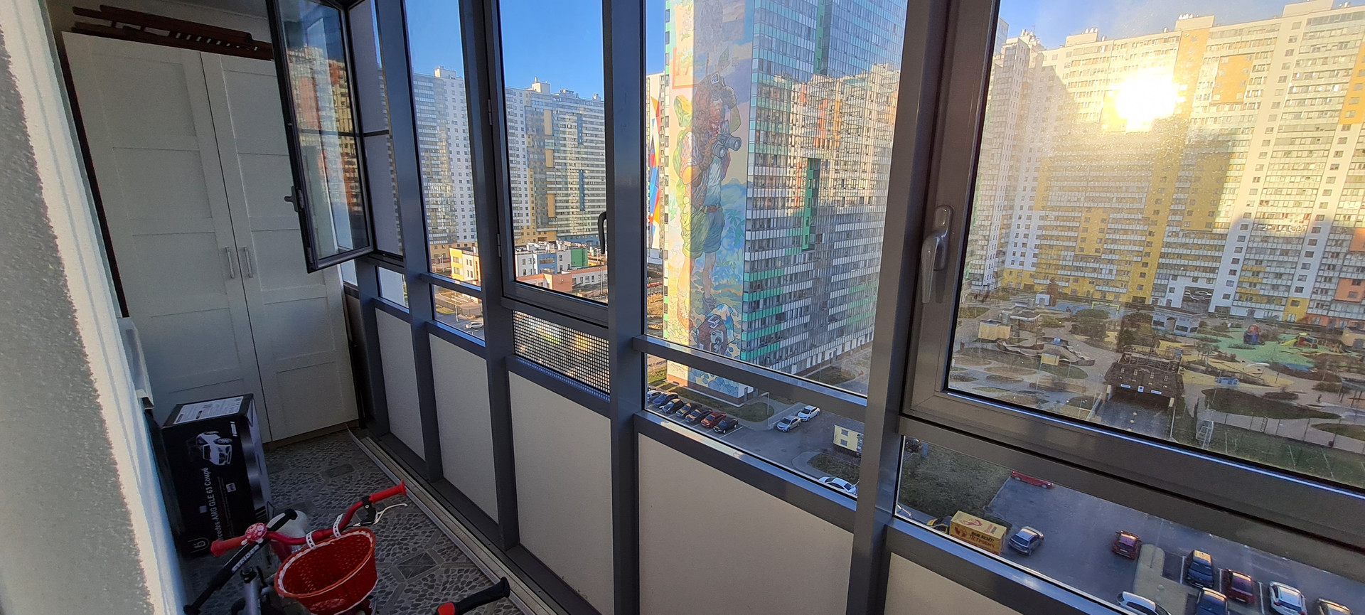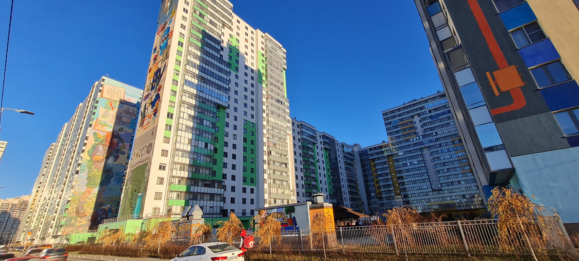 Двор с потрясающей детской площадкой по мотивам «Алисы в стране чудес», закрытый, без возможности въезда машин плюс огорожен забором! Есть ещё два тематических сказочных двора в других корпусах куда естественно можно ходить жильцам всего комплекса гулять. Всё что сделано для детей в ЖК Граффити, вы не найдёте ни в одном жилом комплексе Приморского района!!!