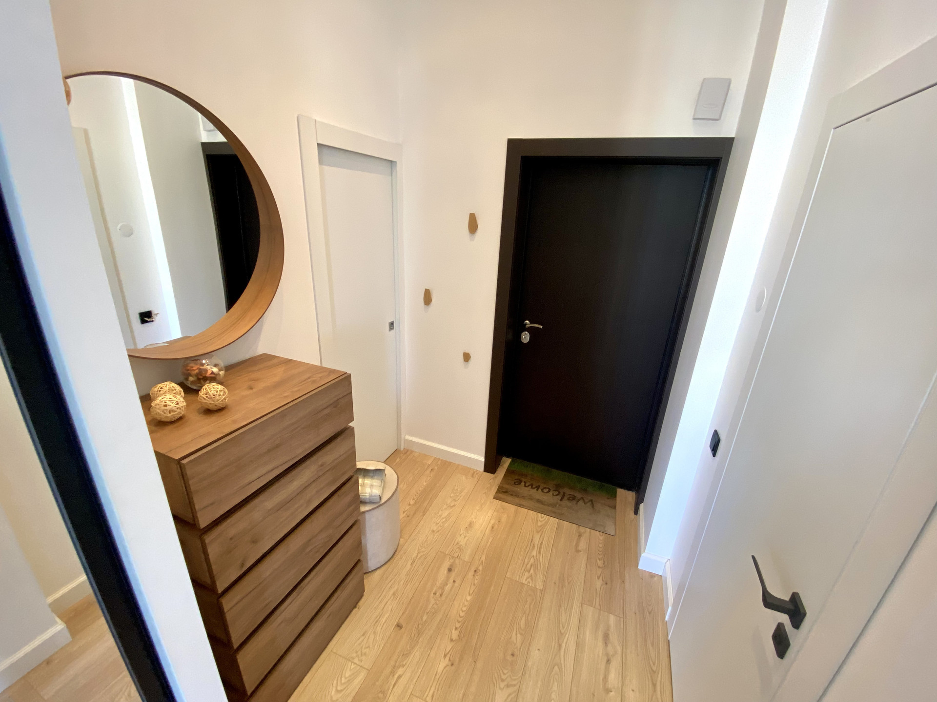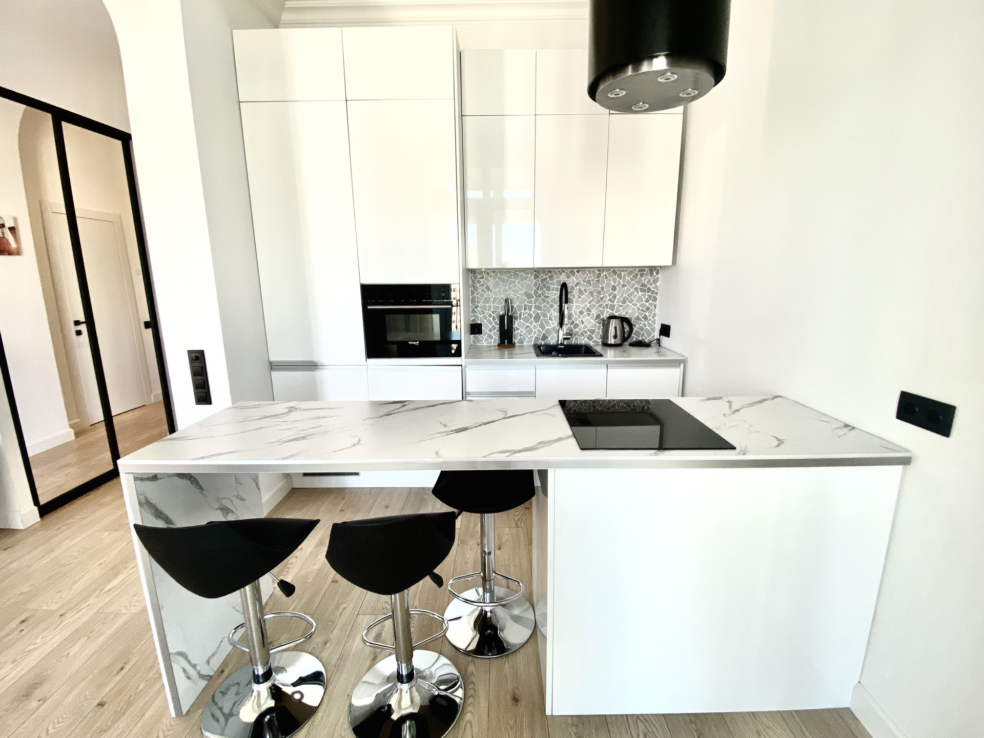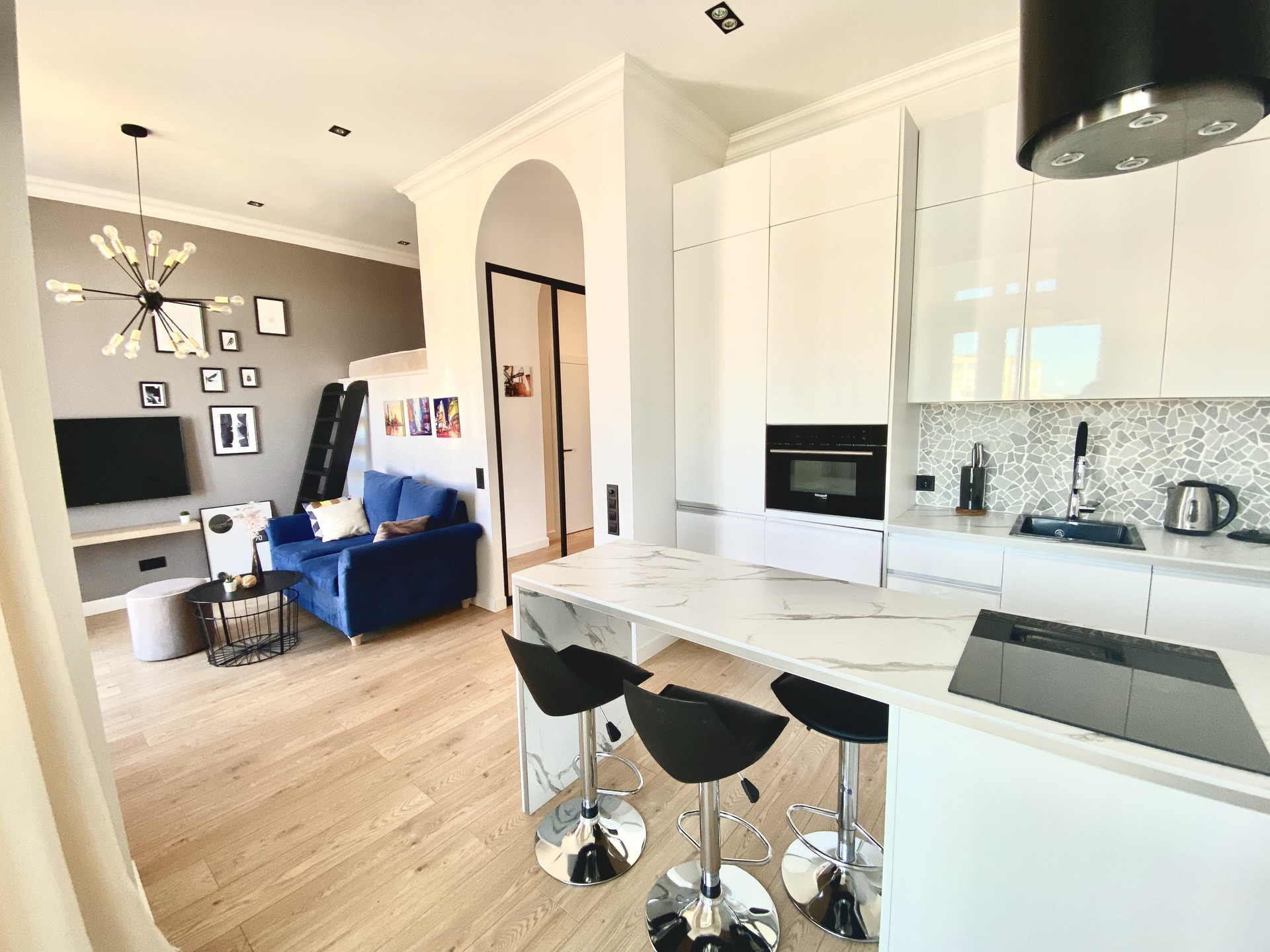 В квартире есть все необходимое для комфортного проживания: вместительная кухня с островом для приема гостей и подвесной вытяжкой Maunfeld, посудомойкой Ariston, встроенной стиральной машиной Beko, холодильником, приточная вентиляция, конвекторы в полу. Также предусмотрена отдельная гардеробная и вместительный шкаф-купе для хранения.