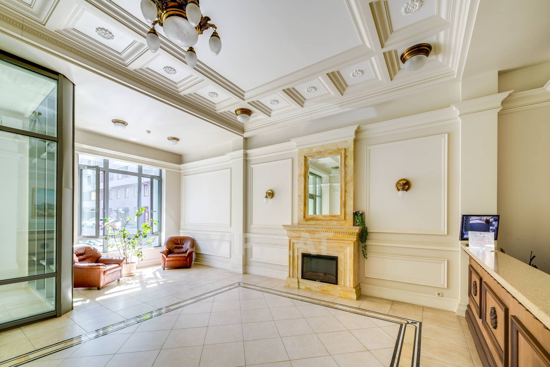 Дом построен по принципу закрытого двора. На этаже 3 квартиры. В доме всего 208 квартир. Парадная с гостевой зоной и уютным камином.
