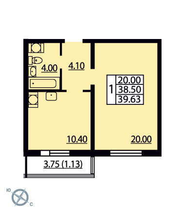 Общая площадь 39.5 м2