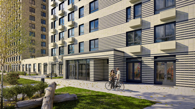 На первых этажах откроются магазины и кафе. Во дворах-парках будет много зелени, появятся скамейки, столы и детские площадки, и всё это будет подальше от машин, для которых мы построим подземный паркинг. В жилом квартале откроются детский сад и школа, а для прогулок появится широкий пешеходный бульвар.