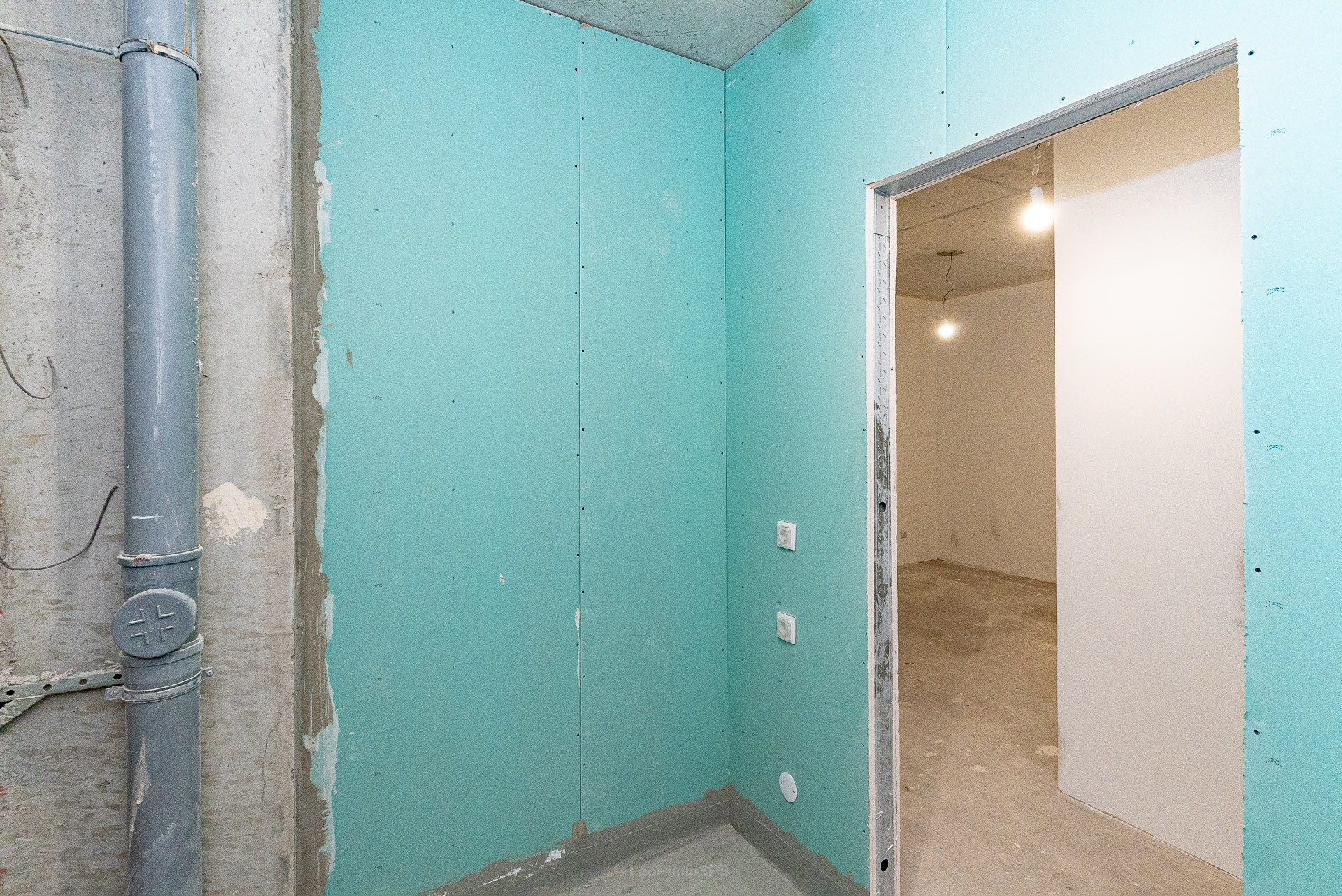 Выполнена подчистовая отделка: стяжка пола, оштукатуренные стены, разводка электрики. Качественная стальная сейфовая входная дверь.