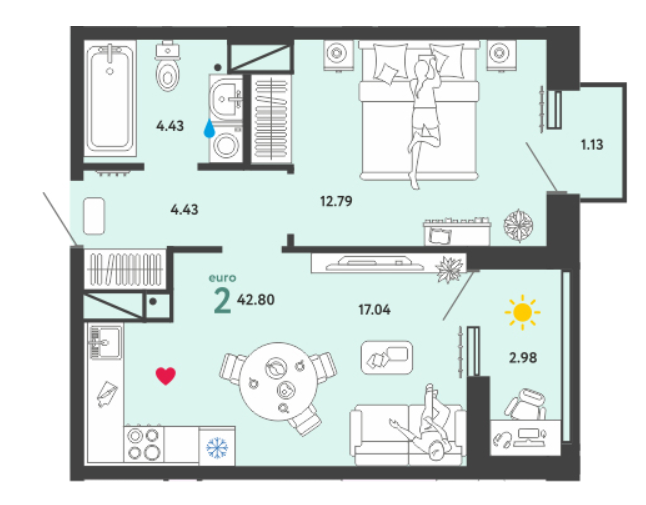 Общая площадь 42.8 м2