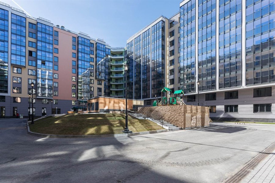 Во всех жилых зданиях предусмотрены красивые и просторные входные группы, для удобства жильцов предусмотрен подъем лифта с уровня паркинга. В закрытом охраняемом дворе размещены детские площадки, пешеходные зоны, украшенные современными элементами уличного декора, цветниками, малыми архитектурными формами.