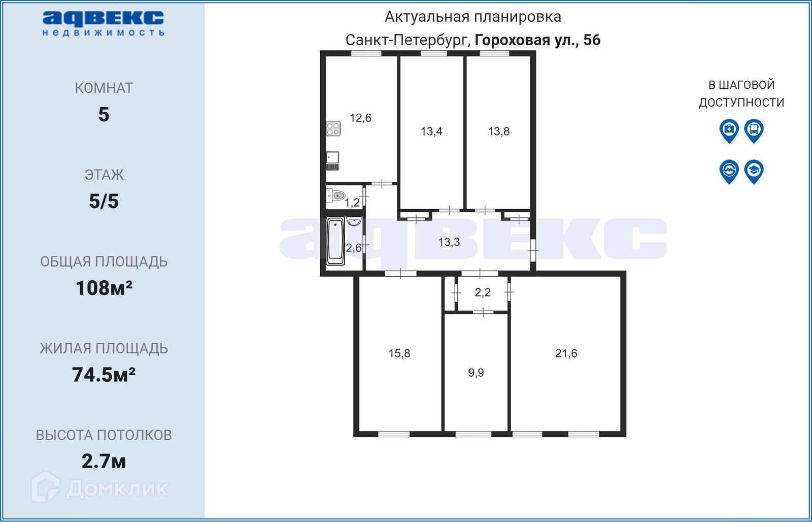 5-комнатная квартира, 108 м2, этаж 5 / 5, на продажу в Санкт-Петербурге, Гороховая улица, 56