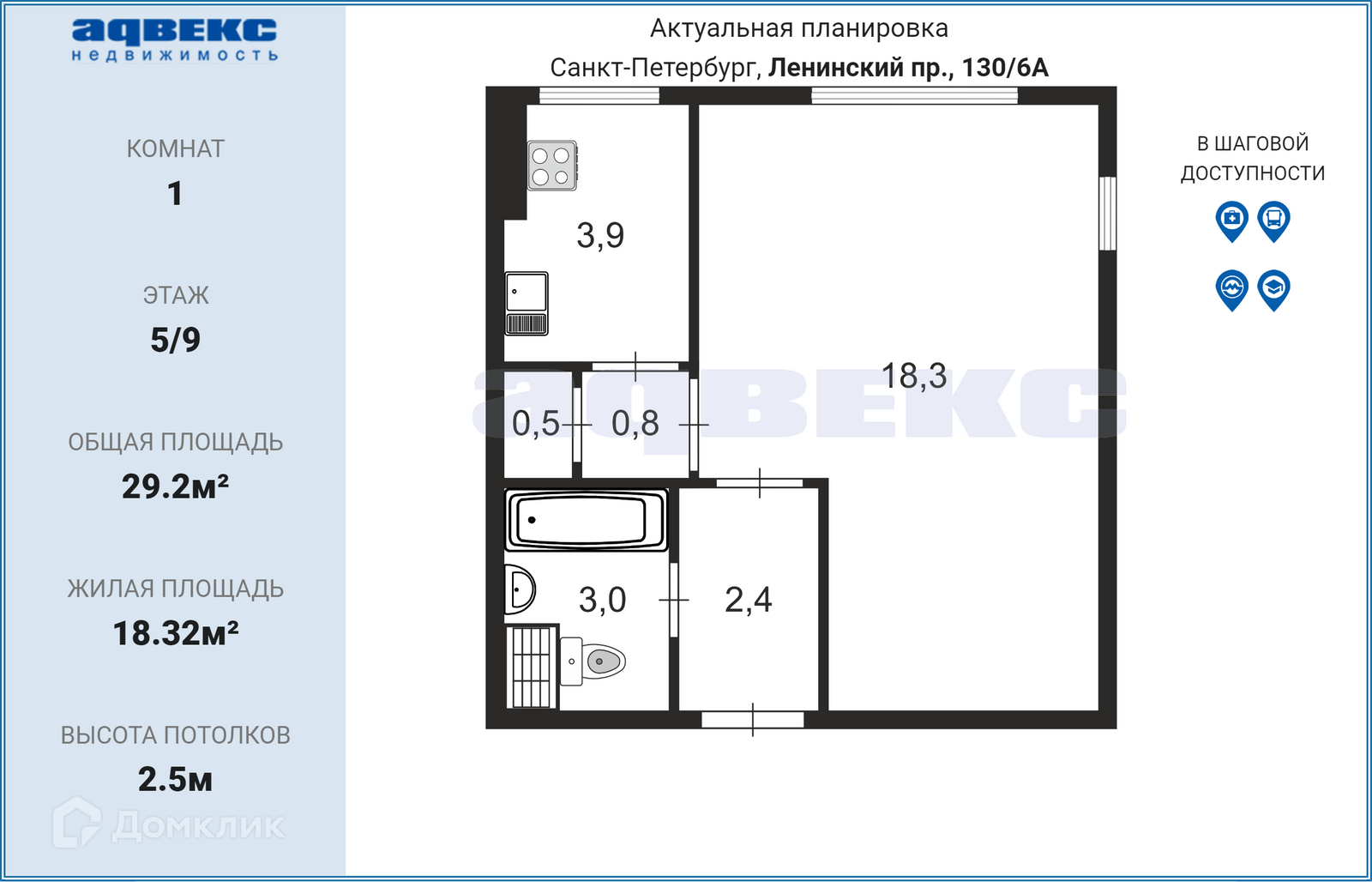 1-комнатная квартира, 29.2 м2, этаж 5 / 9, на продажу в Санкт-Петербурге, Ленинский проспект, 130/6