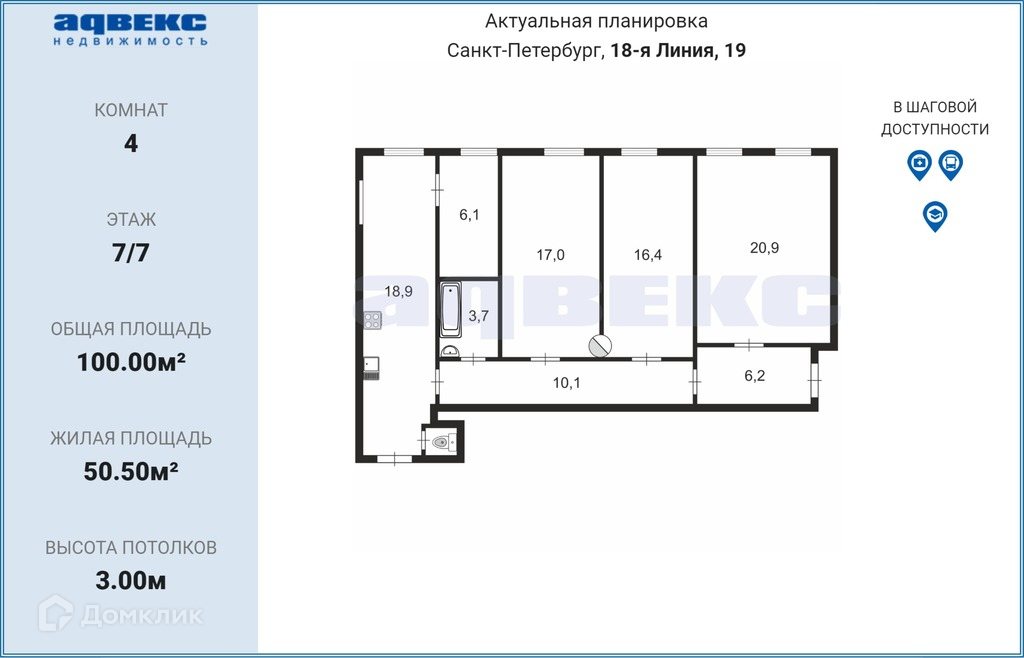 3-комнатная квартира, 100 м2, этаж 7 / 7, на продажу в Санкт-Петербурге, 18-я линия Васильевского острова, 19