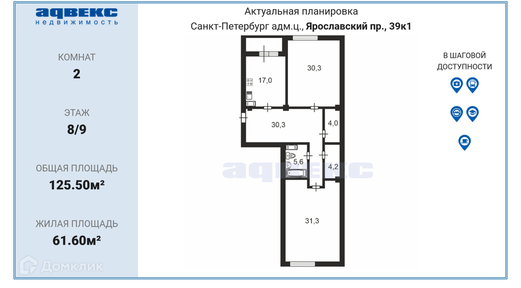 Жилая площадь 61.6 м2
