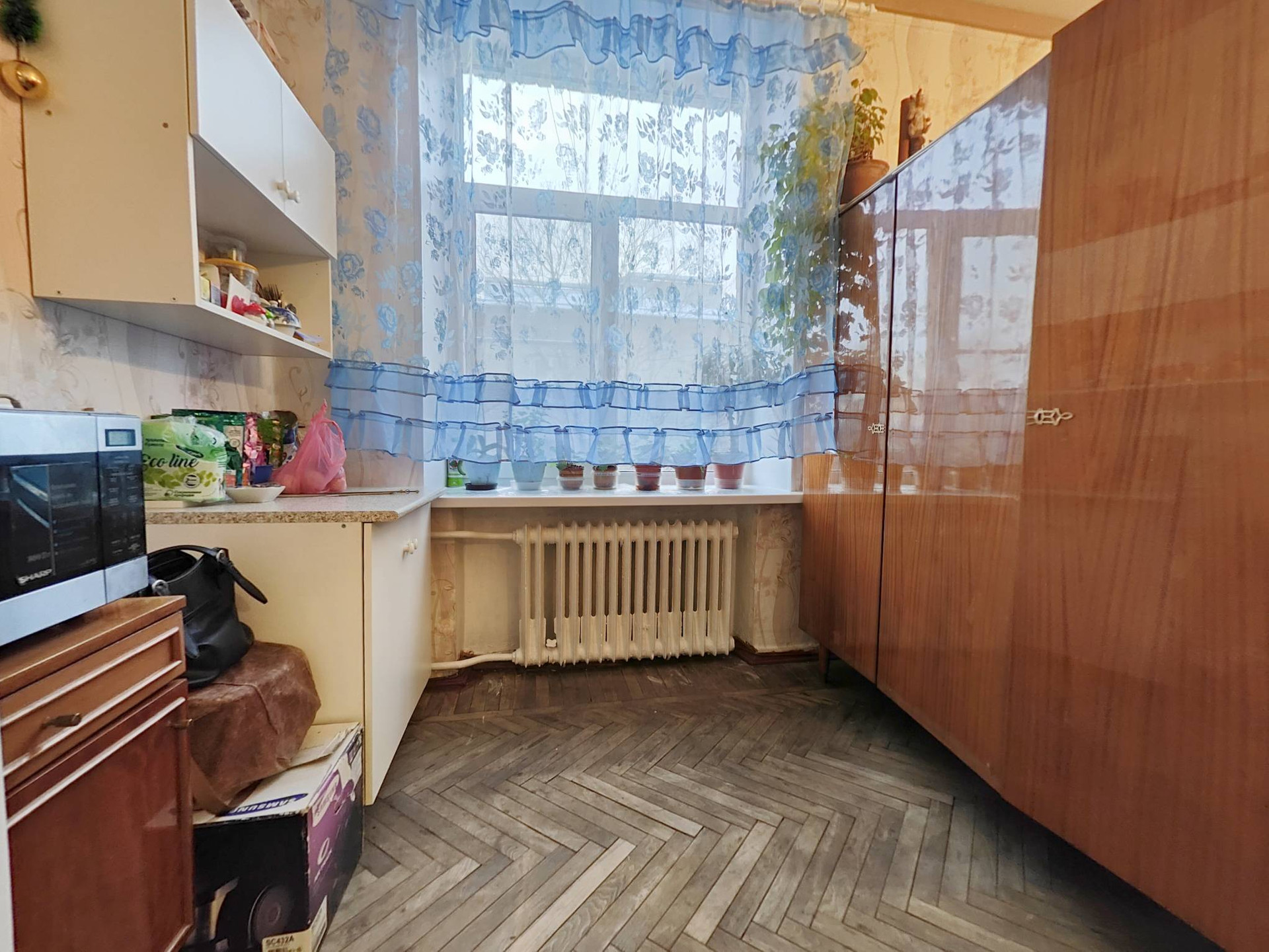 Вы можете обладать теплой квартиры с удобной планировкой в сталинском доме. Светлая двух-сторонняя квартира с интересной планировкой предусматривающая:  большую кухню,  просторные изолированные комнаты из которых открывается красивый вид  на зеленый двор,  особенность планировочного решения в двух комнатах -два панорамных окна сторона света СЗ (вечернее Солнце),  квадратная - просторная прихожая с вместительным встроенным шкафом, высокие потолки с элементами лепнины.