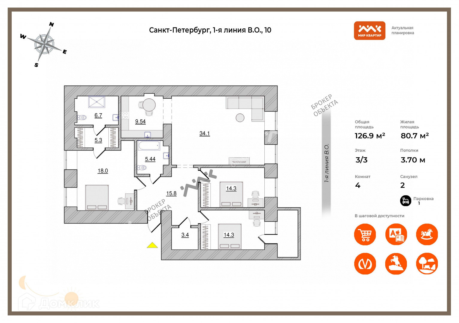 4-комнатная квартира, 126.88 м2, этаж 3 / 3, на продажу в Санкт-Петербурге, 1-я линия Васильевского острова, 10